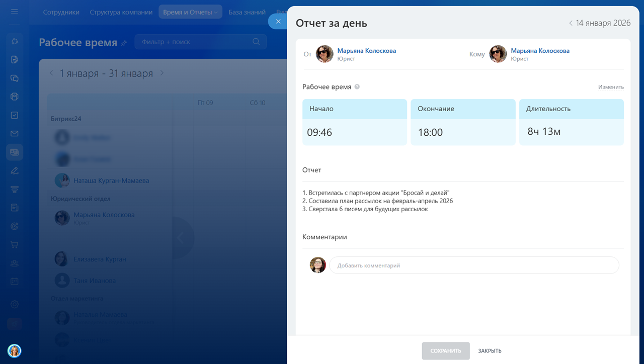 Если нужно посмотреть отчеты из «Сделано за день», перейдите в раздел Сотрудники > Время и отчеты > Рабочее время и выберите нужную дату в календаре.