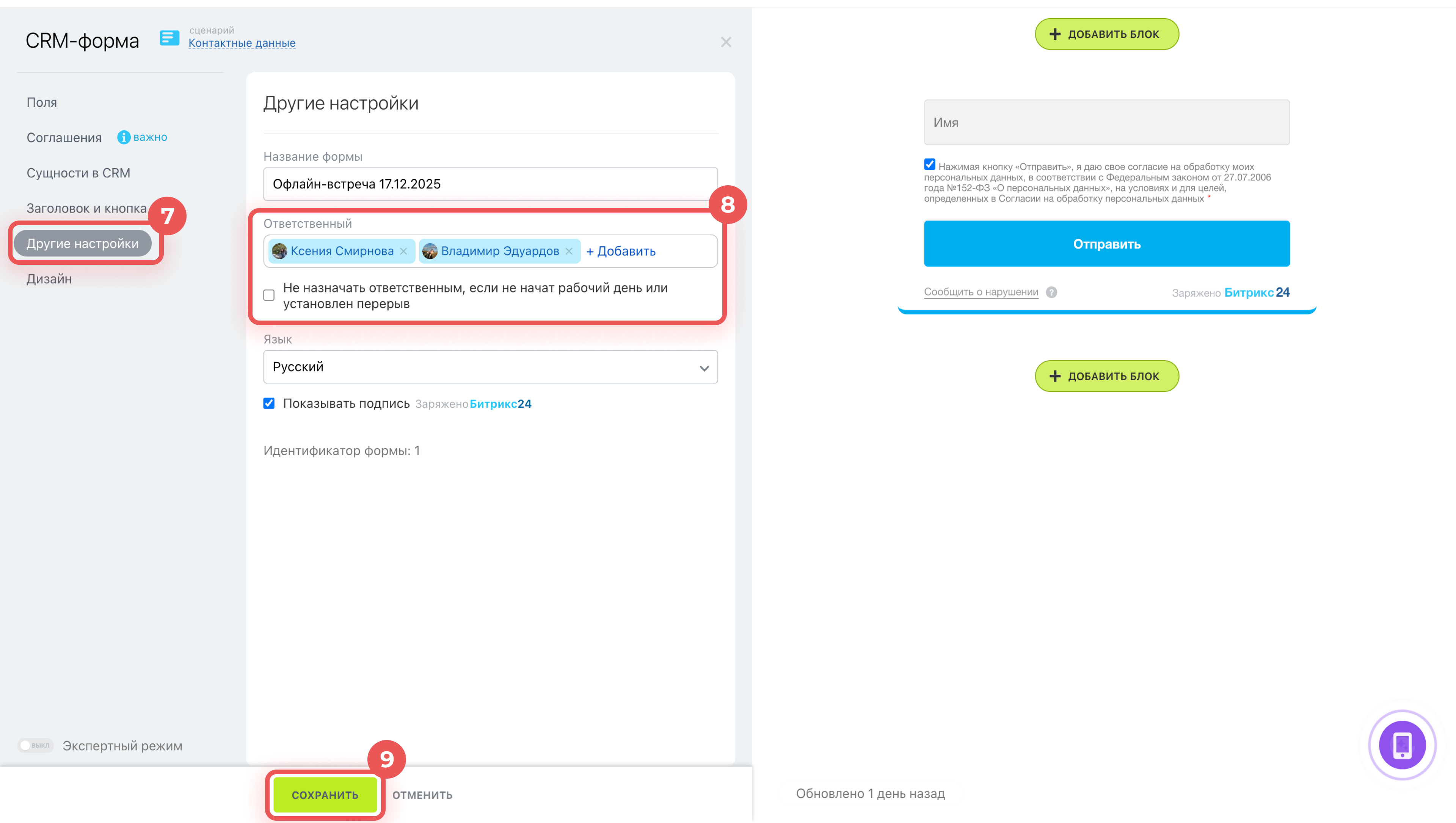 - Ответственный — выберите сотрудников из списка. Элементы, которые создаются в CRM после заполнения форм, распределяются между ответственными по очереди.