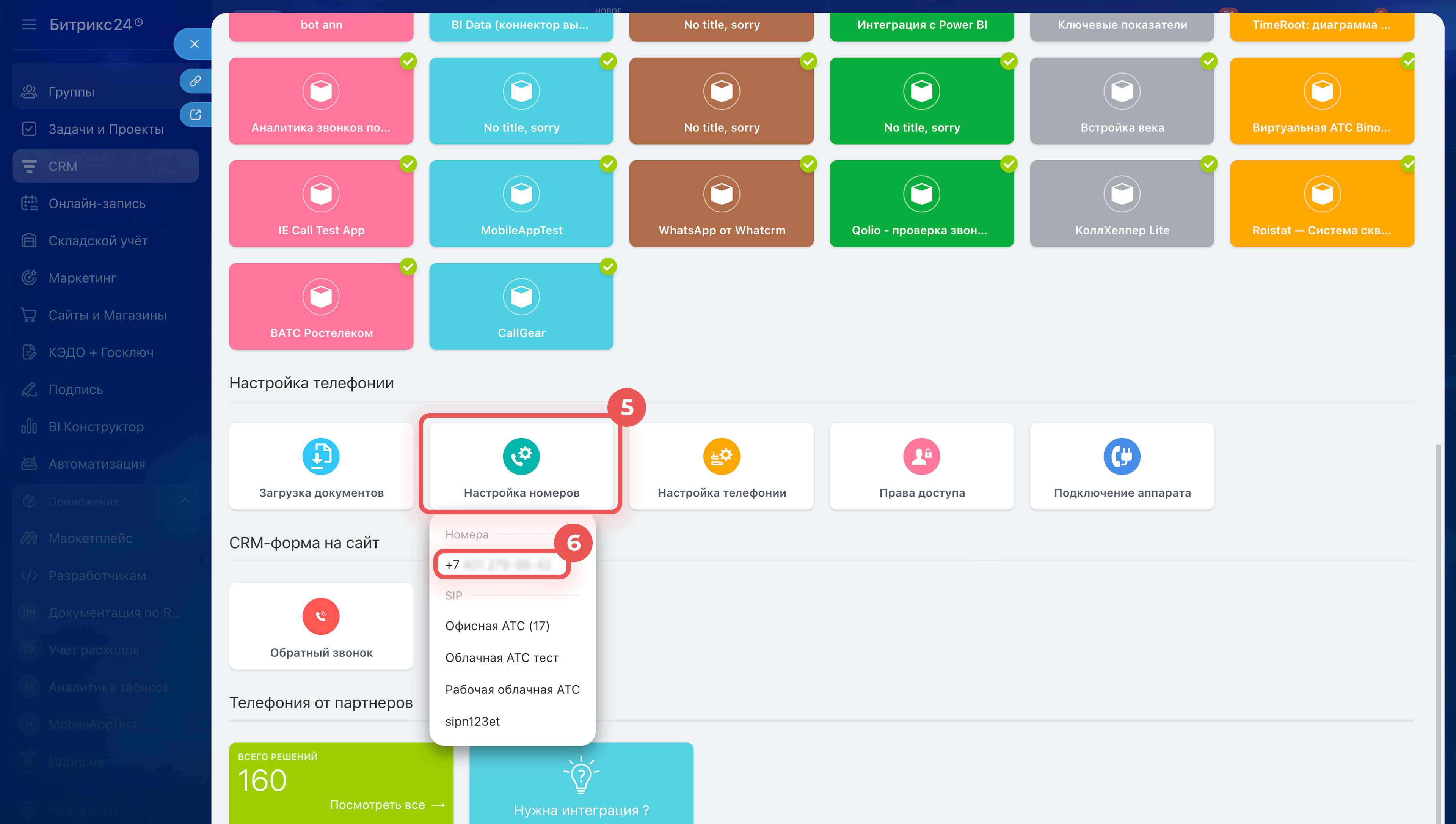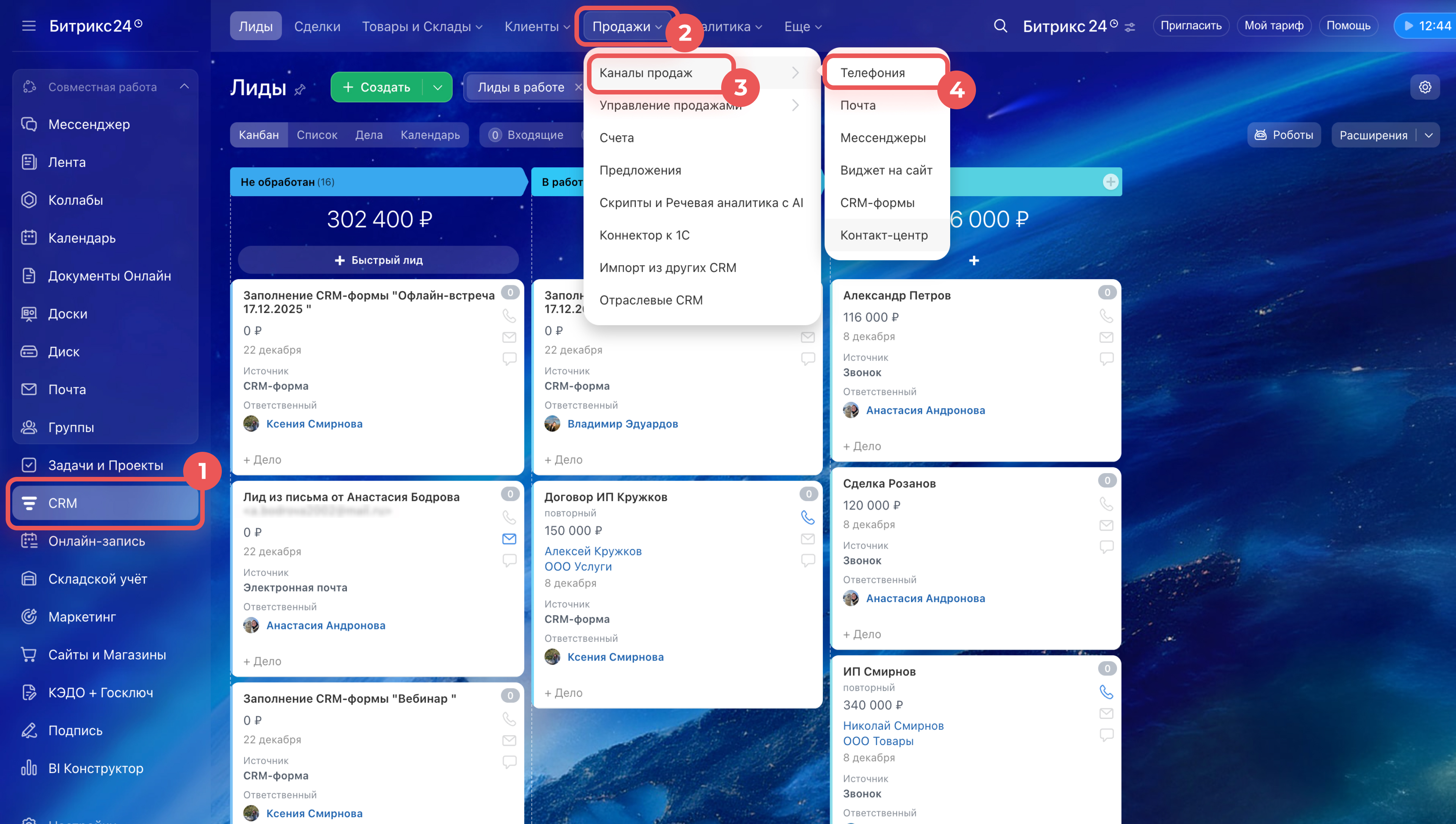 1–4. Перейдите в CRM > Продажи > Каналы продаж > Телефония.
