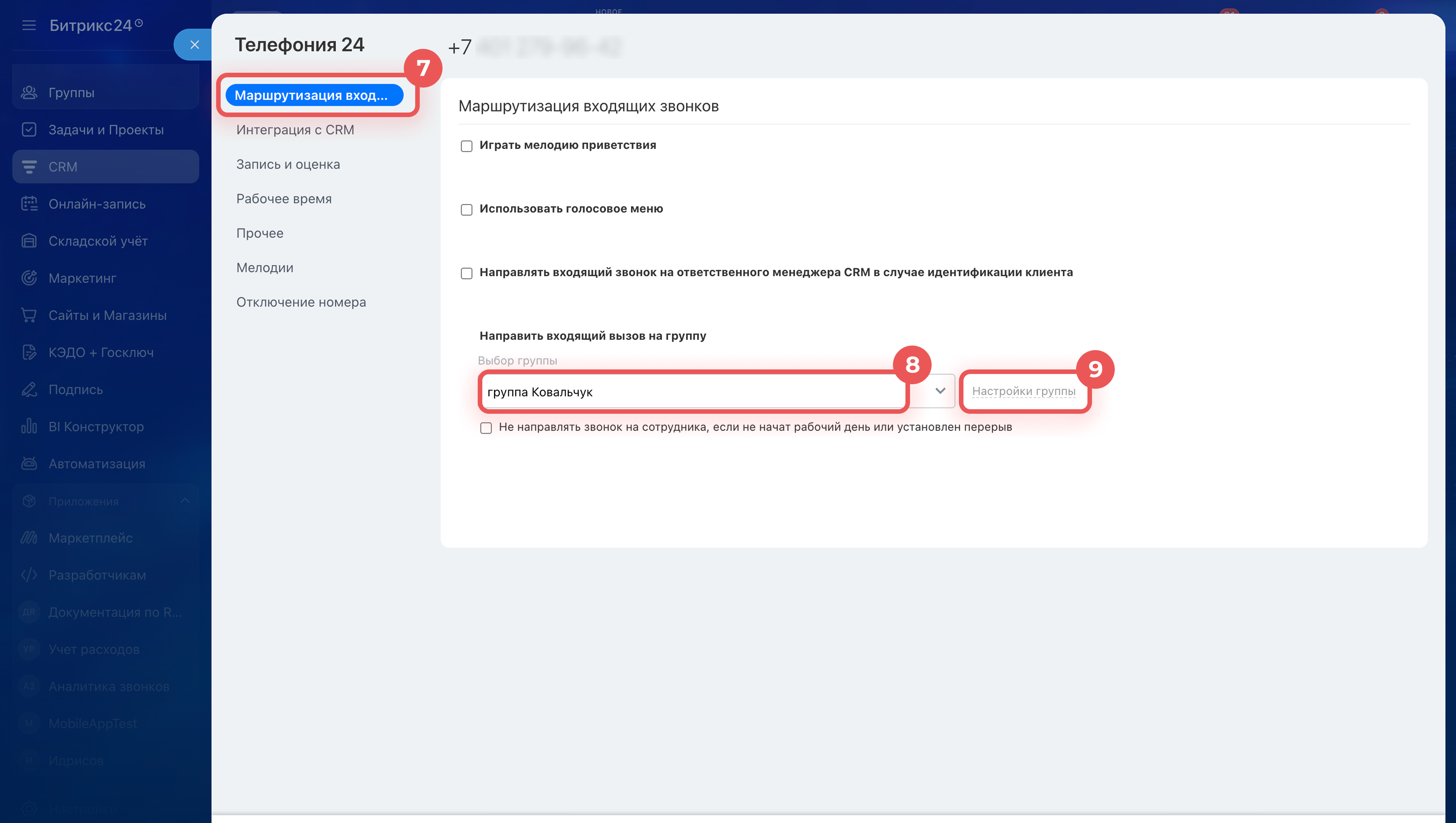 - Распределение входящих звонков между сотрудниками задается в CRM > Продажи > Каналы продаж > Телефония > Настройка номеров. Выберите номер, перейдите на вкладки Маршрутизация входящих звонков и Интеграция с CRM.