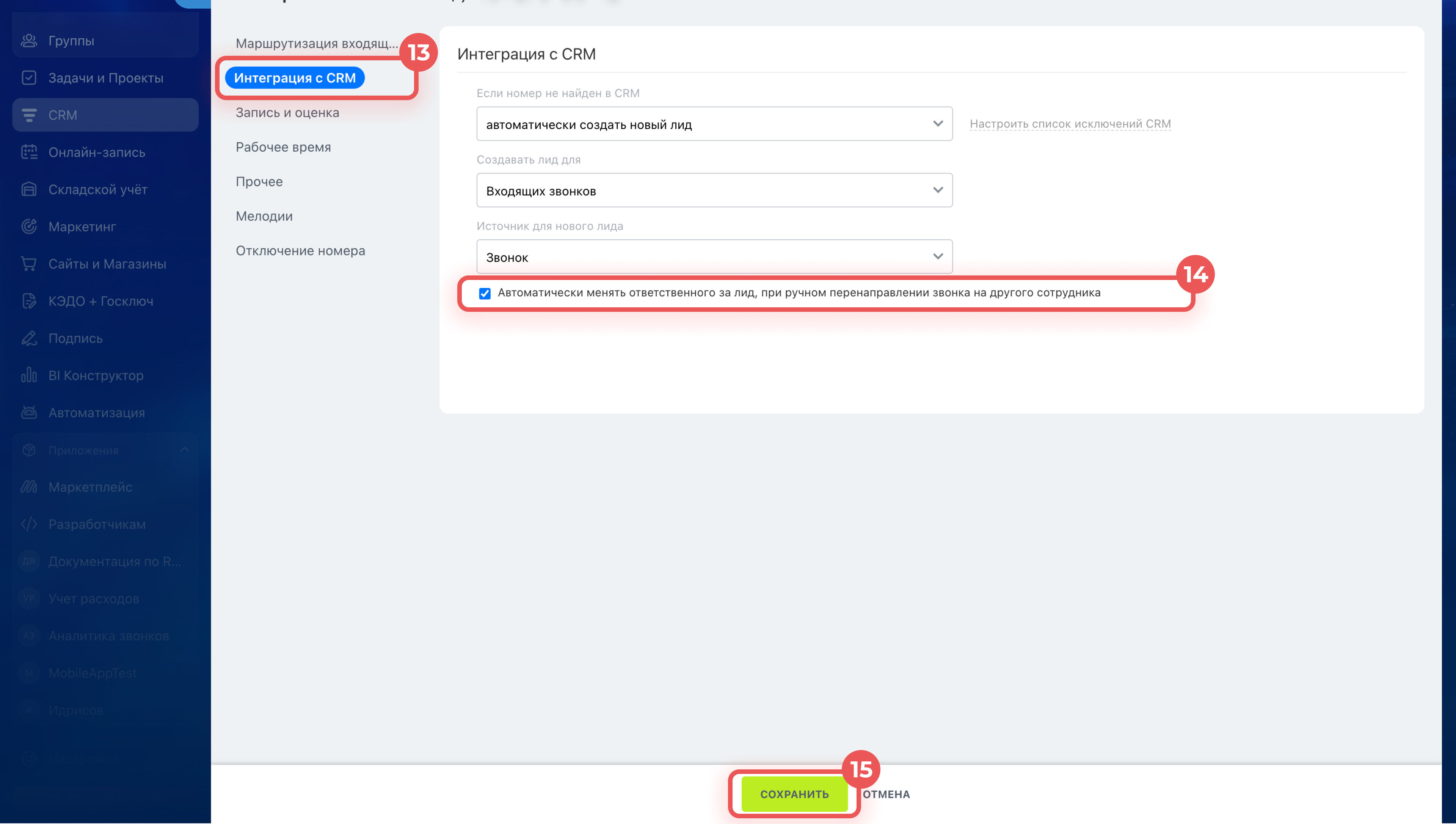 14. Включите опцию Автоматически менять ответственного за лид при ручном перенаправлении звонка на другого сотрудника, если нужно изменять ответственного при передаче звонка.