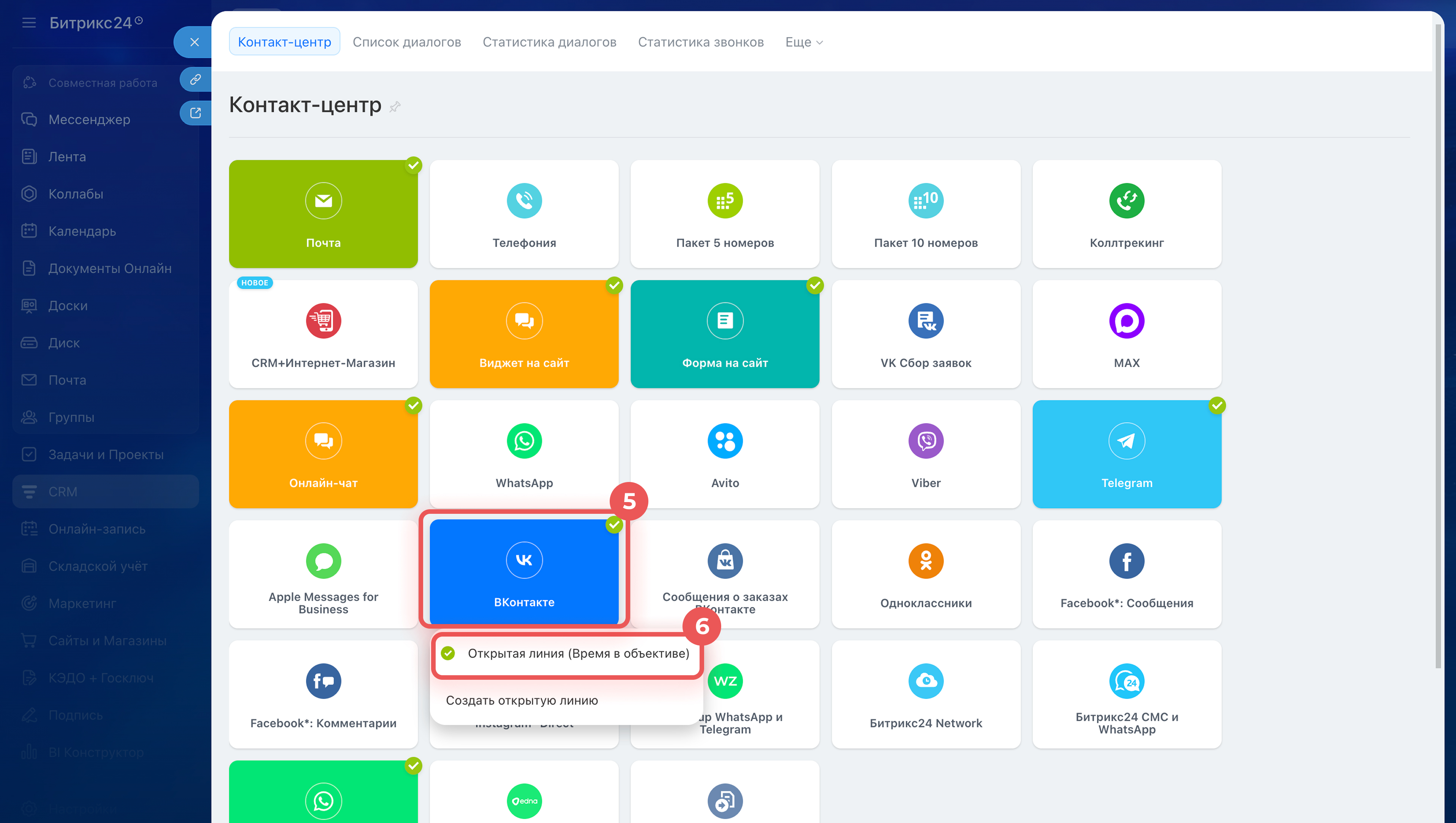 5–6. Выберите канал, подключенный к открытой линии, которую хотите настроить. Например, Telegram или ВКонтакте.