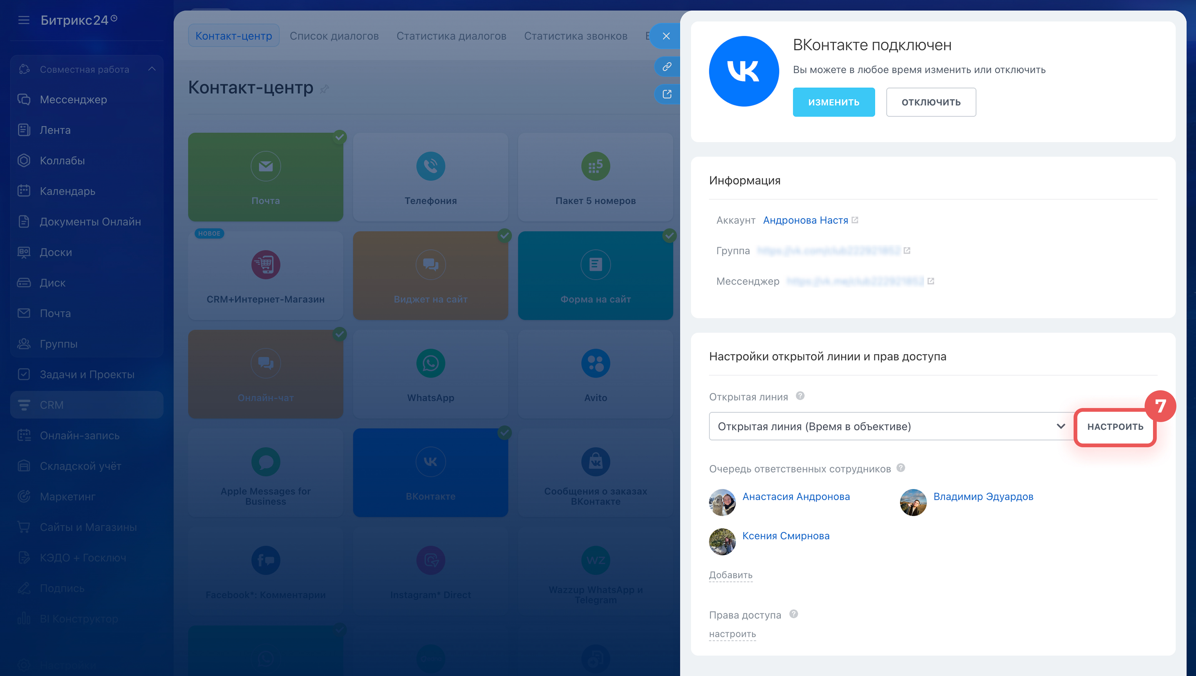 - Распределение обращений из мессенджеров и социальных сетей настраивается в CRM > Продажи > Каналы продаж > Контакт-центр. Выберите нужную линию и нажмите Настроить.