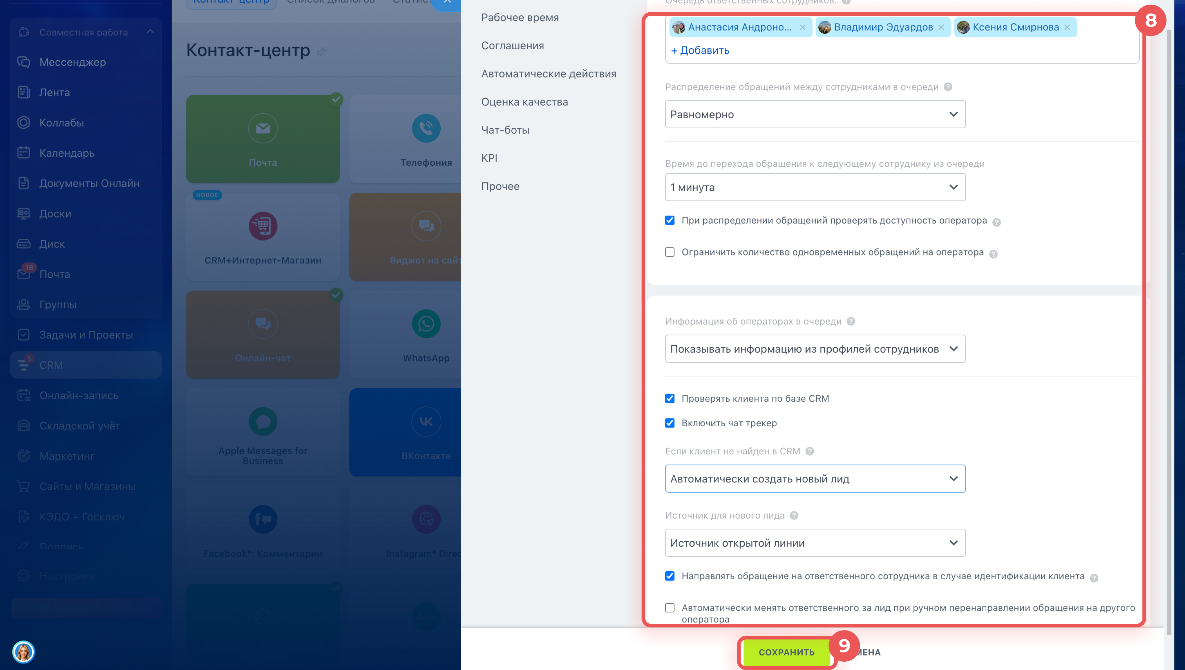 - Очередь распределения лидов и контактов — выберите сотрудников, которым CRM будет назначать обращения. Новые элементы CRM распределятся между сотрудниками в том порядке, в котором указаны их имена.