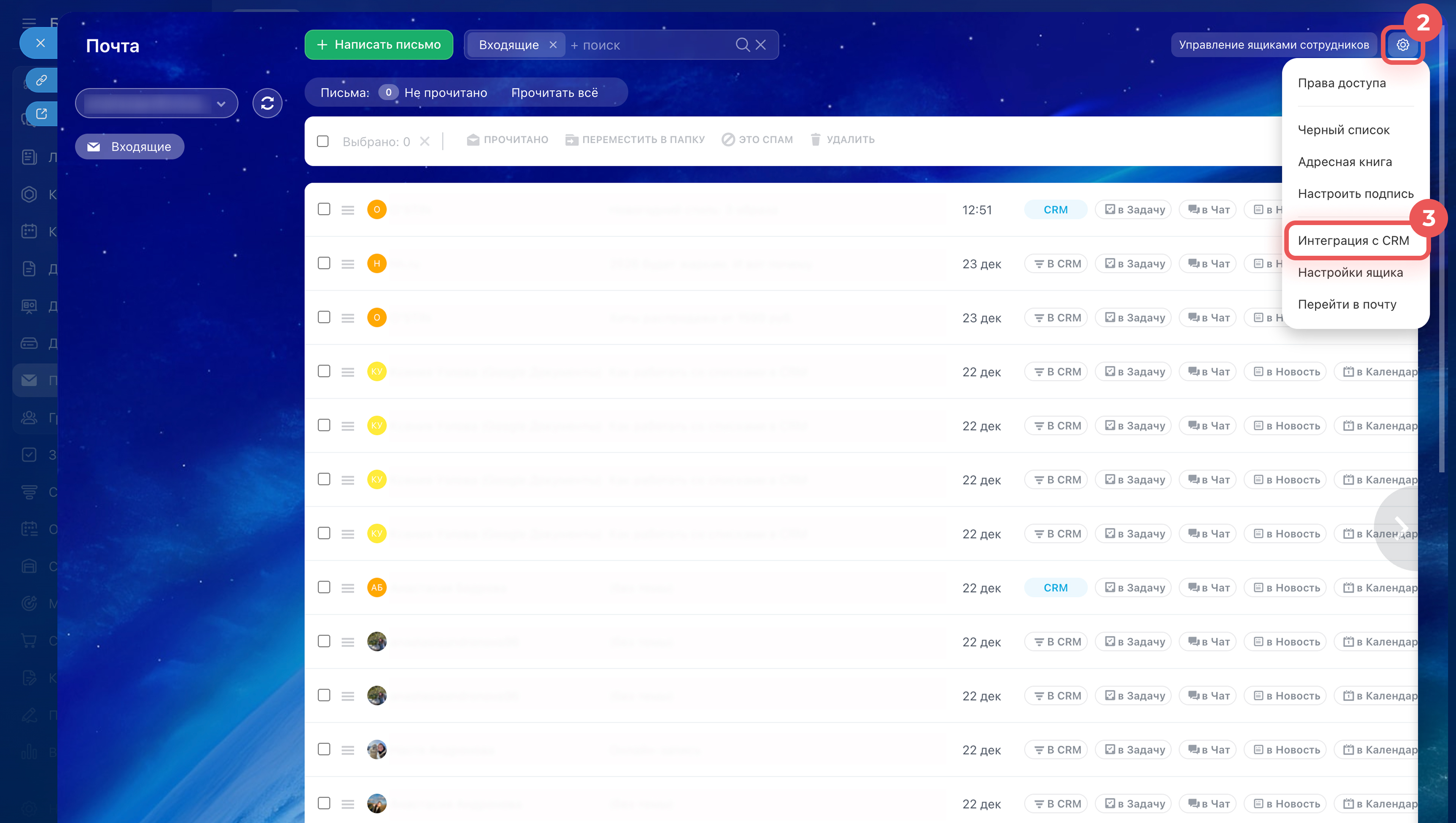 1–3. Перейдите в раздел Почта > Настройки (⚙️) > Интеграция с CRM.