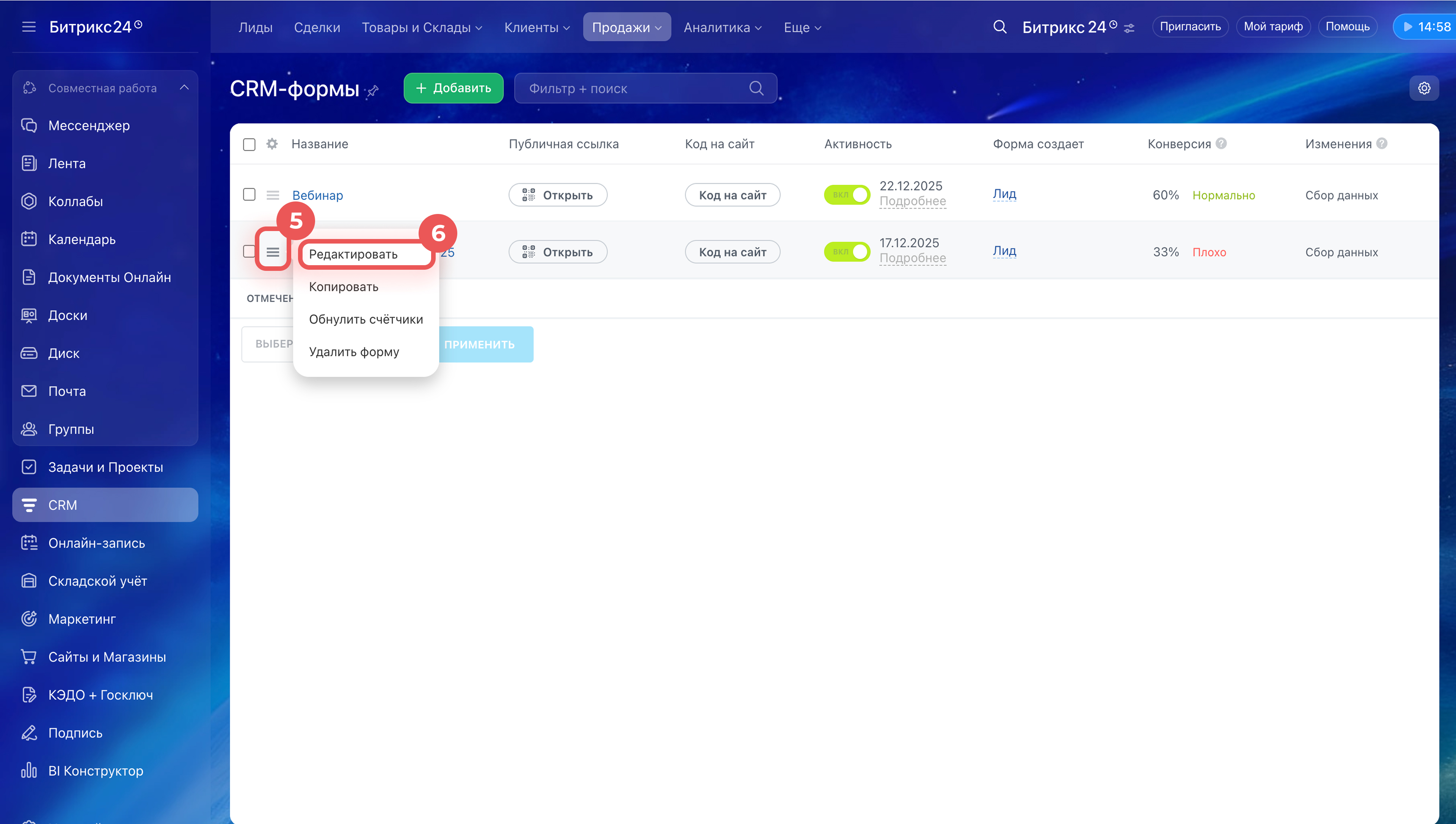 1–4. Перейдите в CRM > Продажи > Каналы продаж > CRM-формы.