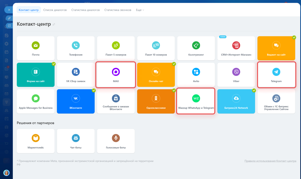 Чтобы начать диалог с клиентом, подключите один из каналов: