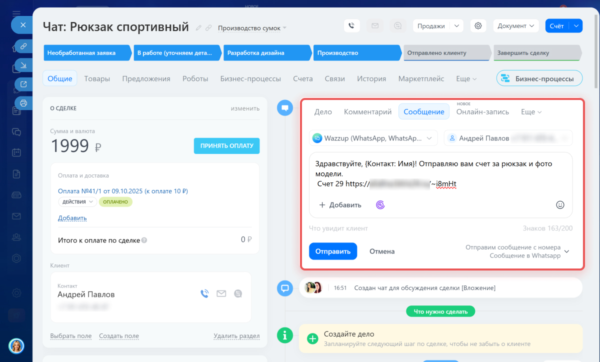 - Объяснили, как первым написать клиенту из CRM в WhatsApp* и Telegram через каналы Wazzup и Edna.ru. Это удобно, если нужно быстро связаться с клиентом, отправить ссылку на оплату или документ.