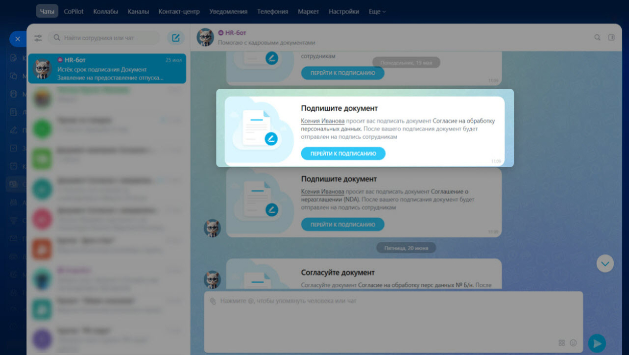Когда инициатор запустит процесс подписания, вы получите сообщение от HR-бота и сможете сразу подписать один или несколько документов.