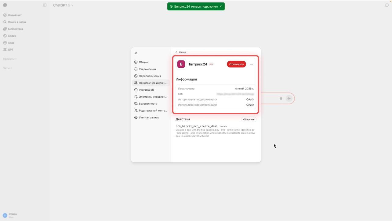 С помощью MCP-сервера можно подключить Битрикс24 к внешним AI-системам, которые вы уже используете в работе, например, ChatGPT или Yandex AI Studio. Это удобно, если вы хотите управлять задачами прямо из чата с вашим виртуальным помощником.