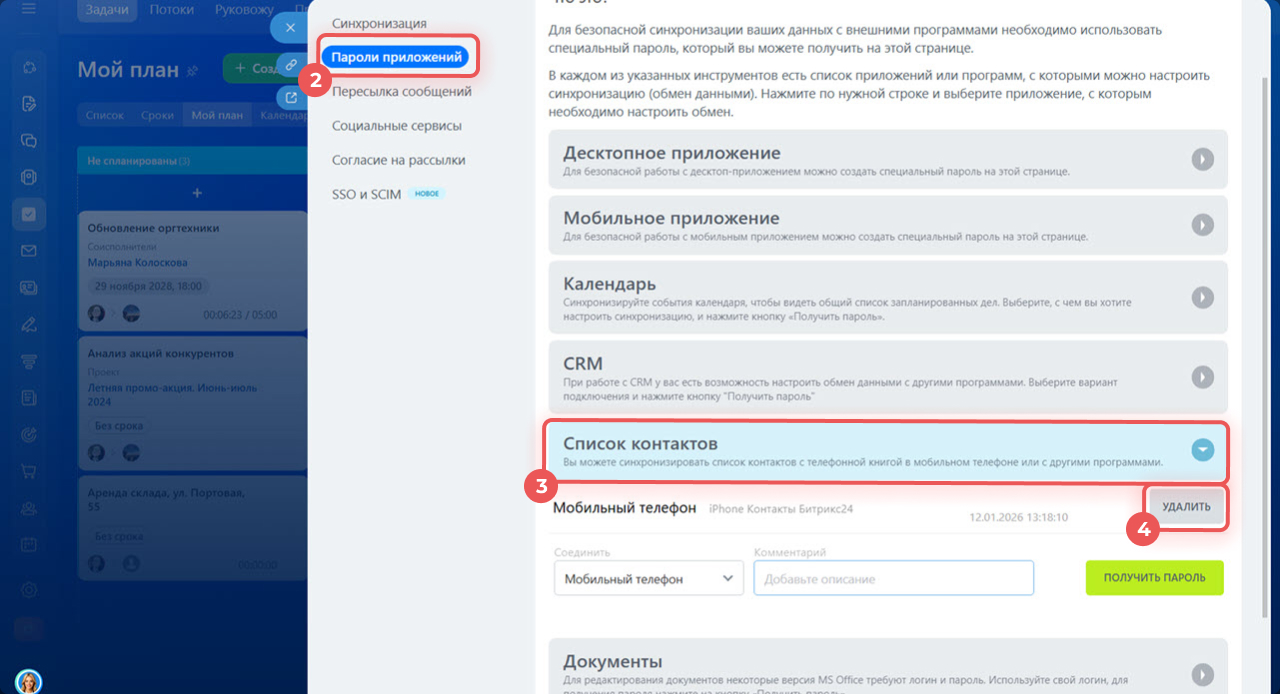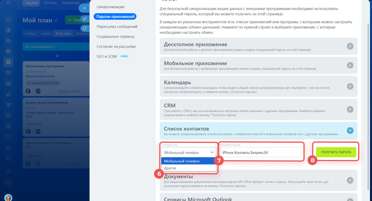Пароли приложений — это специальные пароли для подключения внешних сервисов и устройств к Битрикс24. Их используют, например, для синхронизации календаря или контактов с Outlook, мобильным телефоном и другими сервисами.