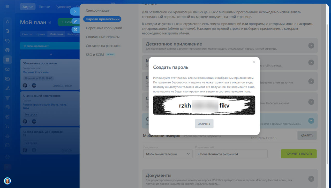 8. Нажмите Получить пароль. Скопируйте его и вставьте в настройках внешнего сервиса вместо обычного пароля от Битрикс24. После этого приложение сможет подключаться к вашему аккаунту Битрикс24 автоматически.
