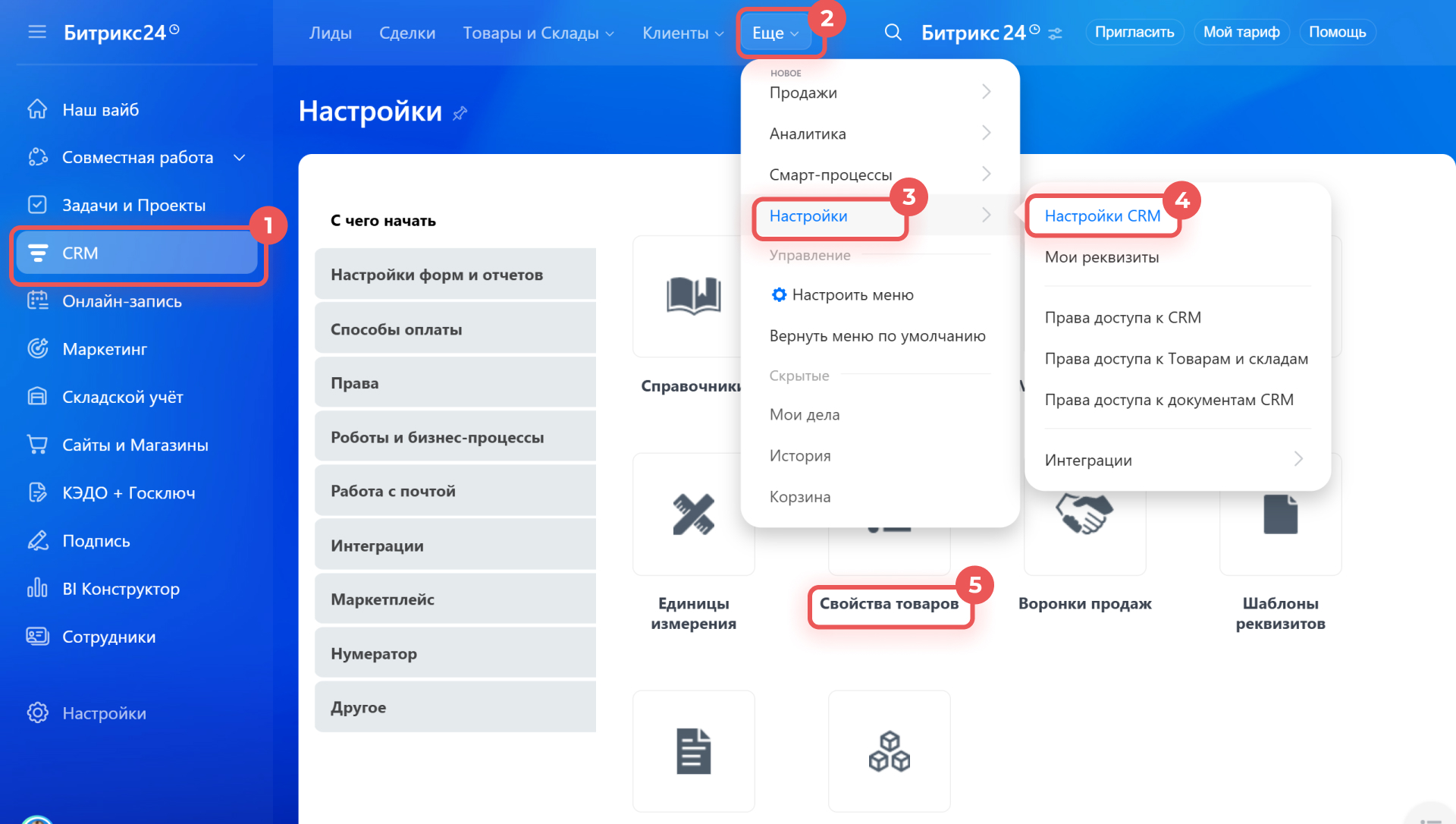 1–5. Перейдите в CRM > Еще > Настройки > Настройки CRM > Свойства товаров.