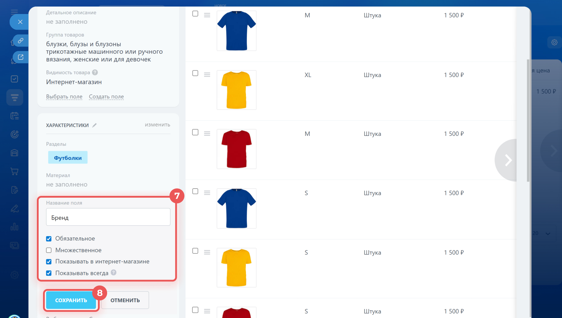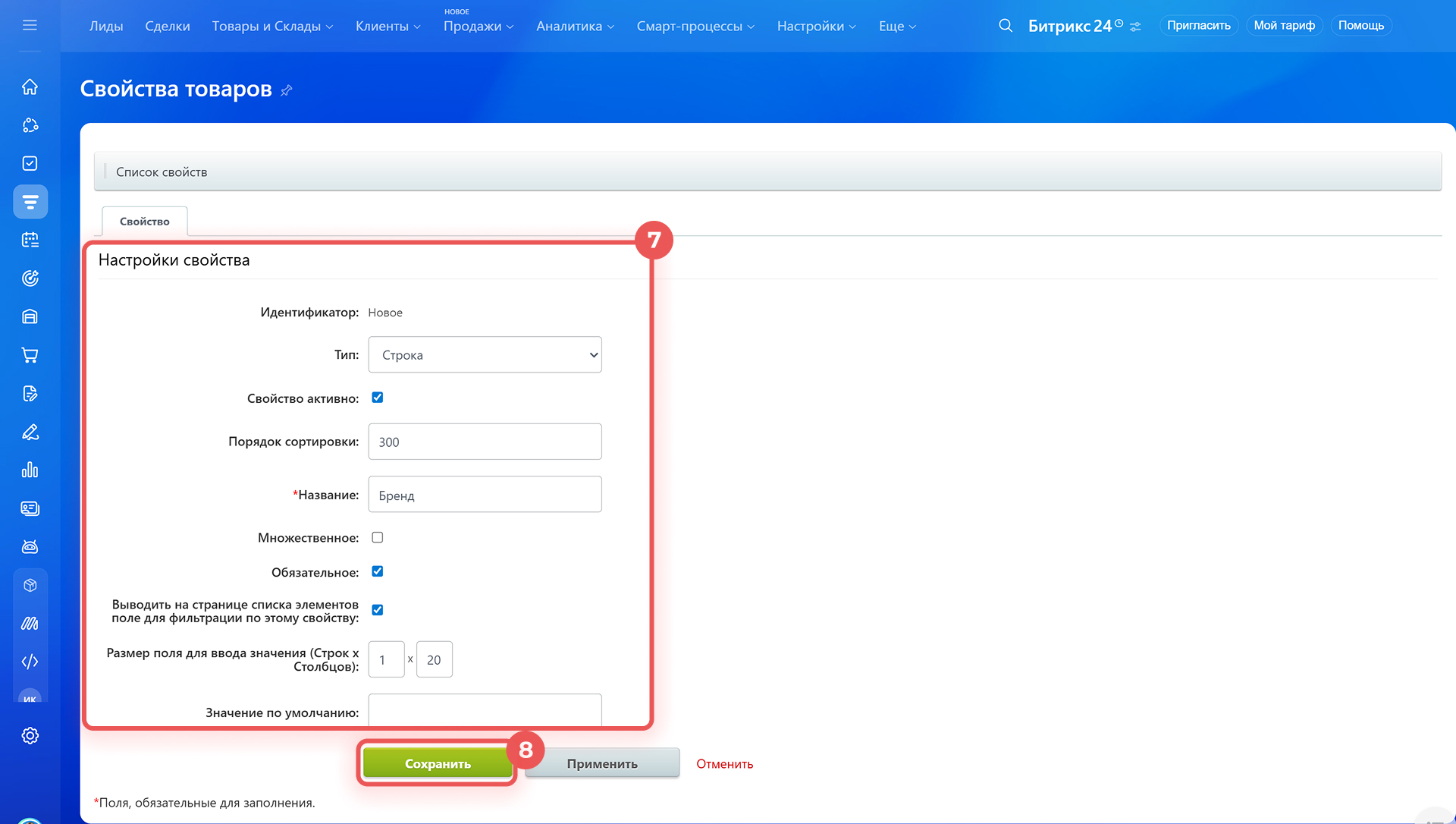 8. Сохраните изменения — свойство добавится в карточку товара или услуги и общий список свойств.