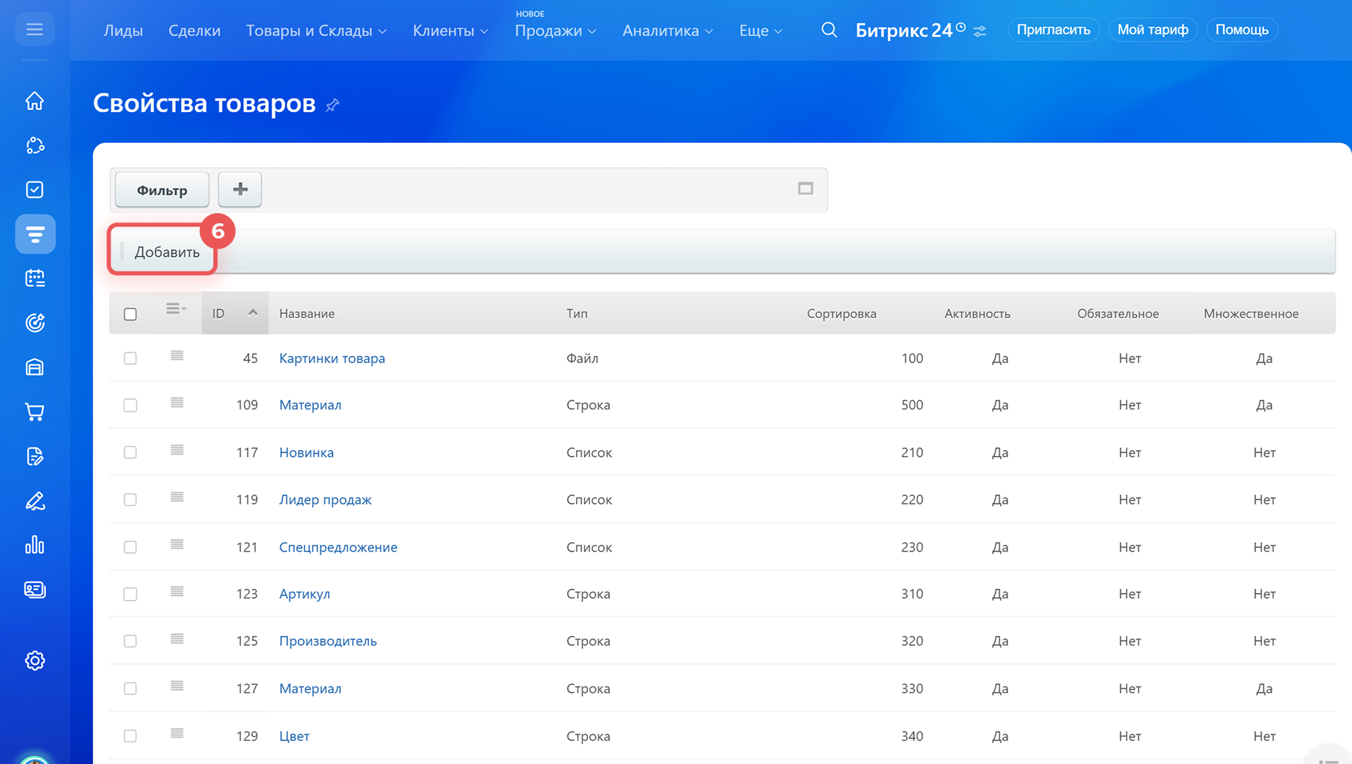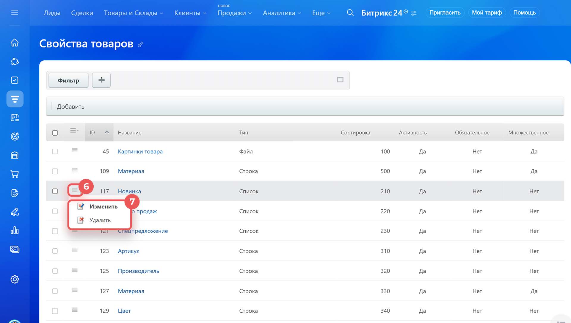 - Изменить настройки свойства можно в карточке товара или в настройках CRM. Удалить его можно только в настройках CRM.