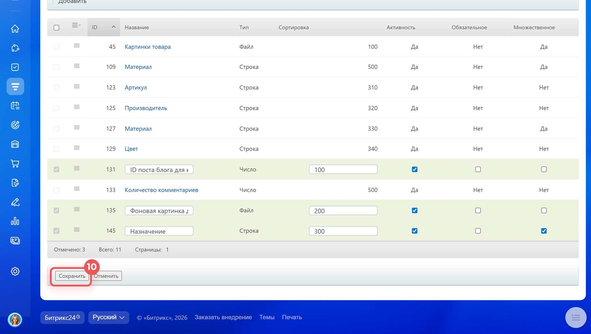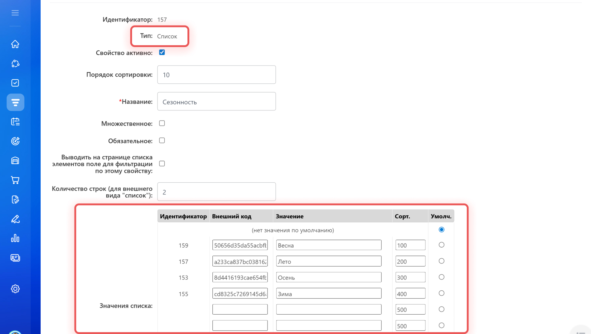 - Порядок сортировки — определяет, в каком месте списка будет отображаться свойство. Чем меньше число, тем выше оно находится. Например, свойство Материал со значением 100 будет отображаться выше, чем Артикул со значением 200.