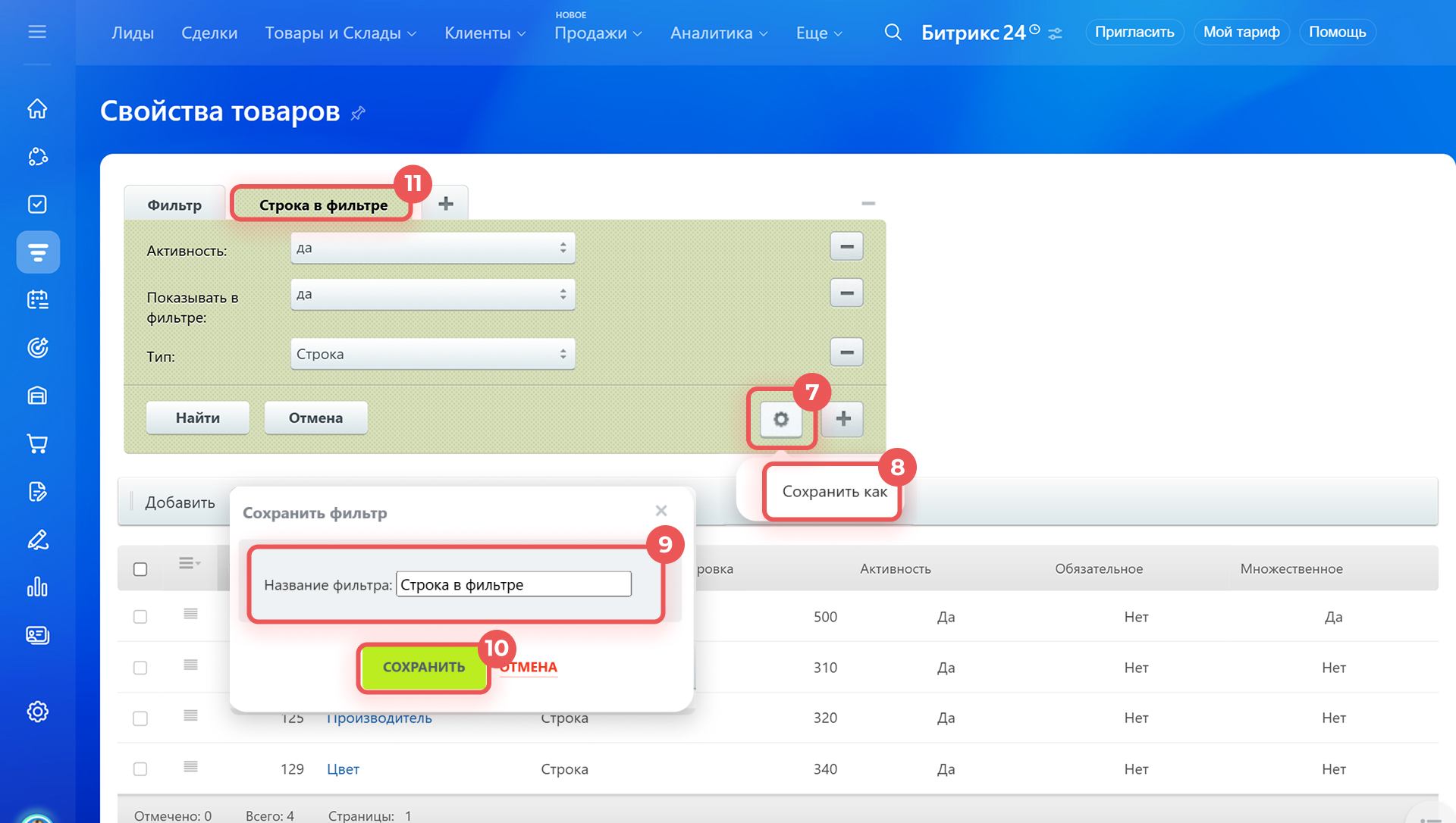 В карточке товара можно задать меньше параметров свойства, чем в настройках CRM. Такой способ удобен, если нужно быстро добавить в карточку новое свойство и включить его в фильтр интернет-магазина Битрикс24.