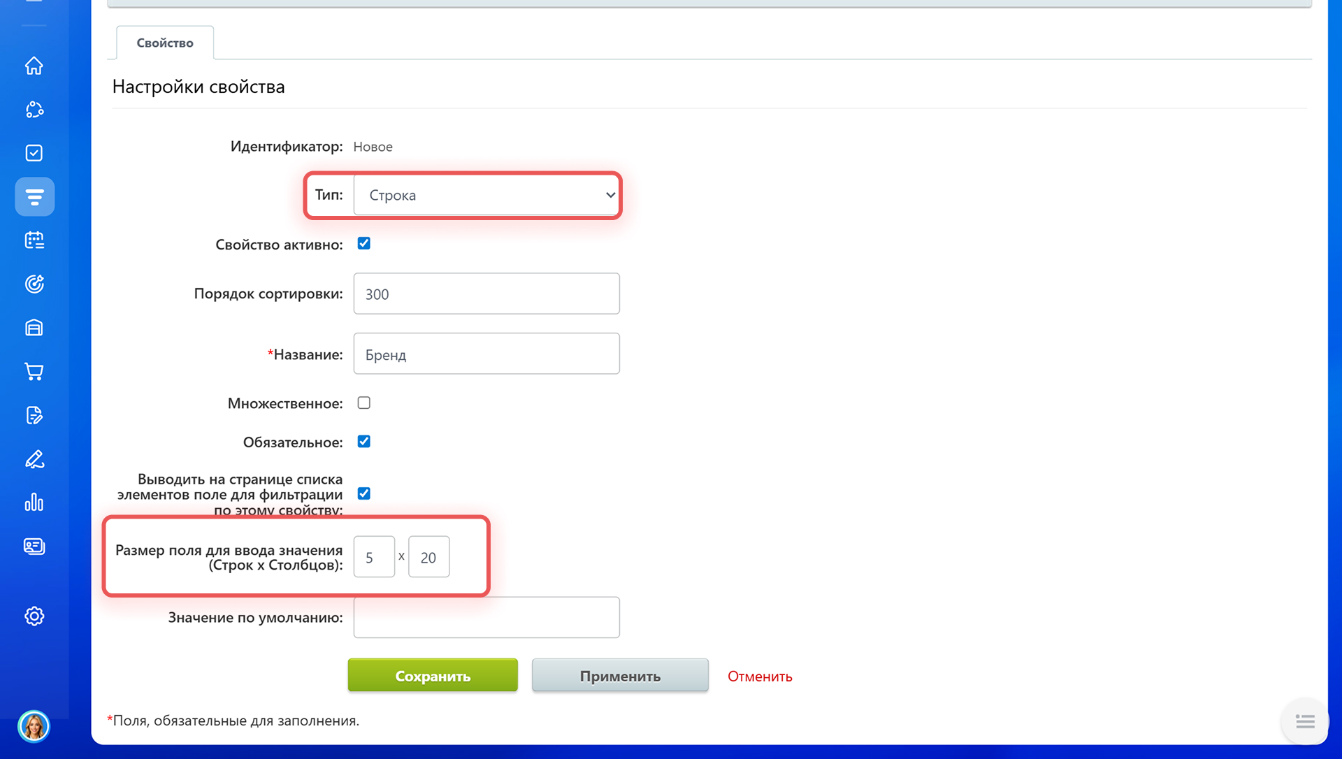 Строка. Опция Размер поля для ввода значения (Строк х Столбцов) задает высоту и ширину поля ввода текста. Например, значение 5 × 20 делает поле выше и удобнее для ввода длинных описаний.