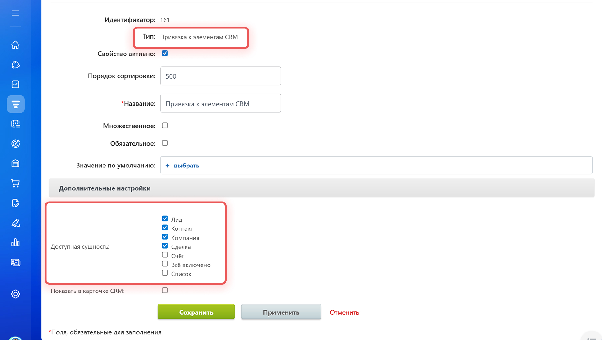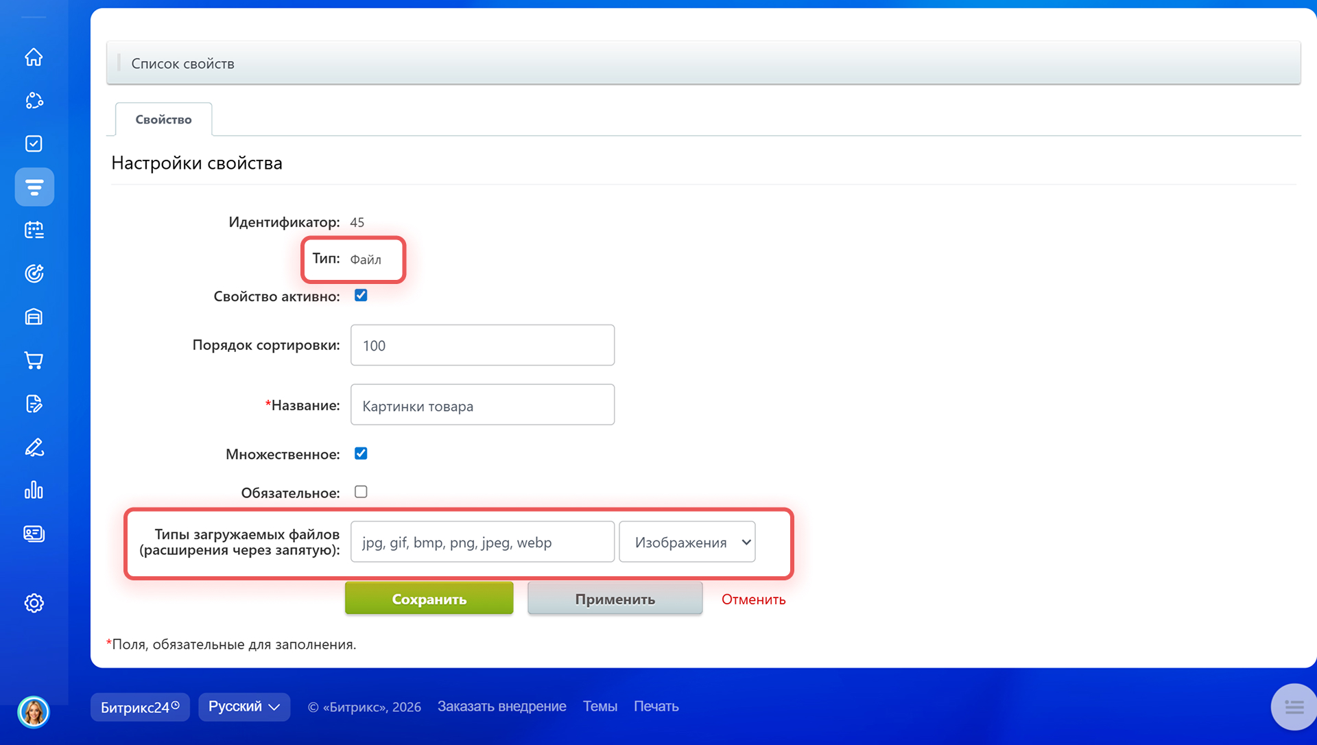 Типы пользовательских полей - Свойство активно — если опция включена, свойство можно добавить в карточку товара или услуги.