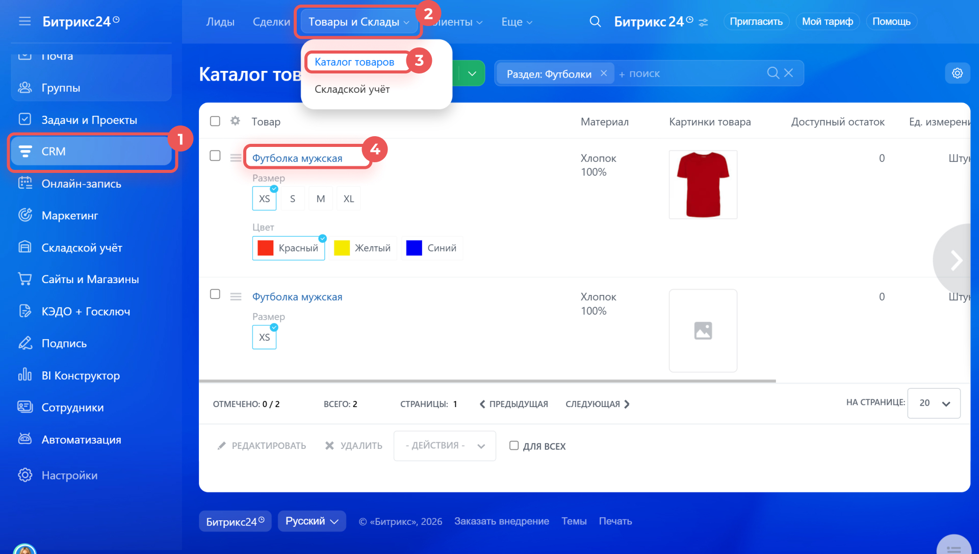 1–3. Перейдите в CRM > Товары и Склады > Каталог товаров.