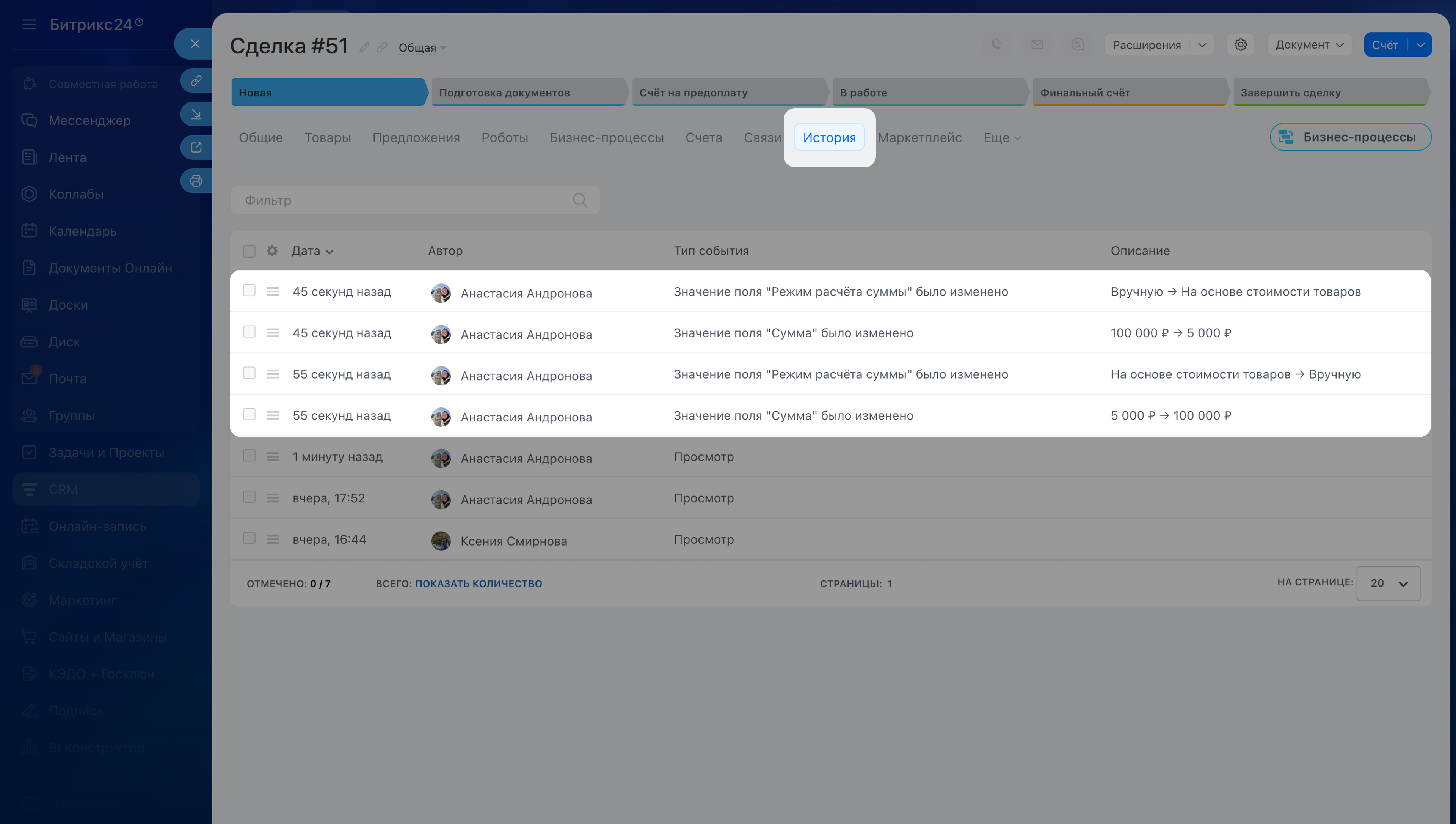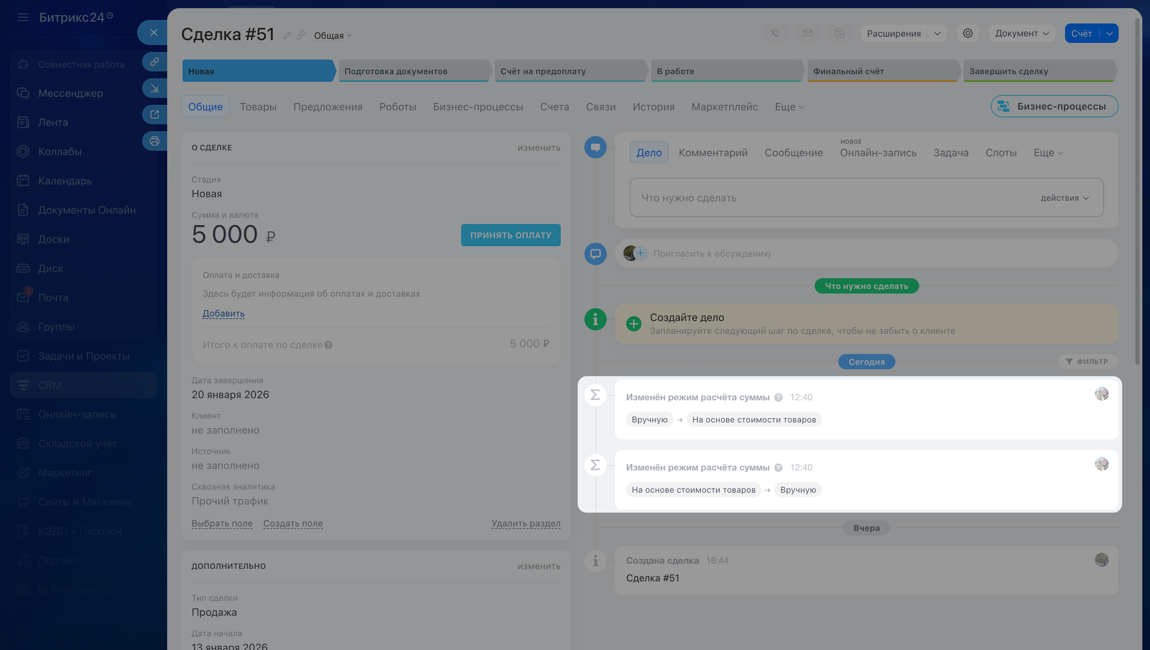 CRM автоматически рассчитает сумму на основе товаров и услуг в сделке. Переключение режимов отображается в таймлайне сделки и на вкладке История.
