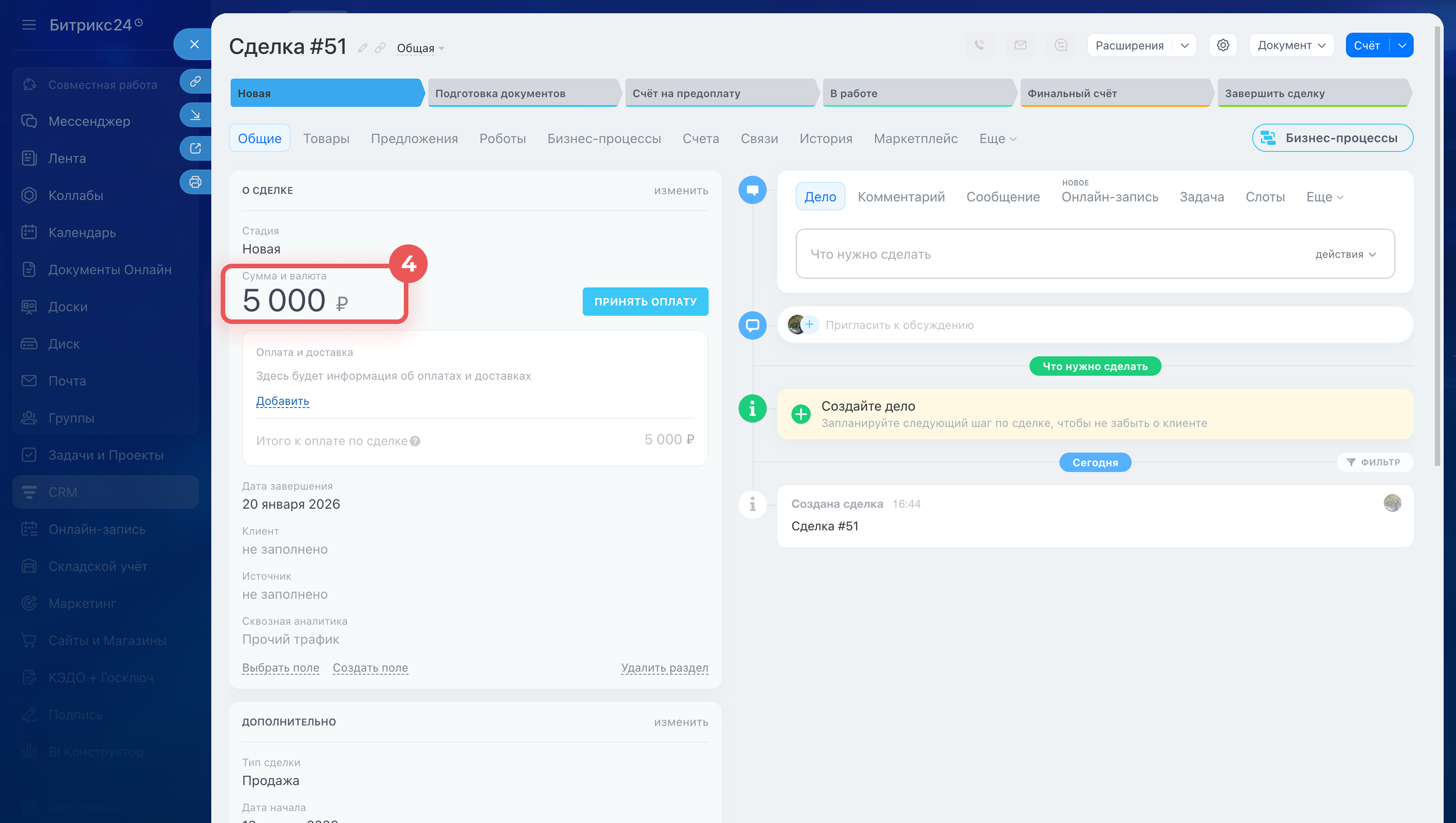 В сделке без товаров сумма равна нулю — поле Сумма сразу доступно для редактирования.