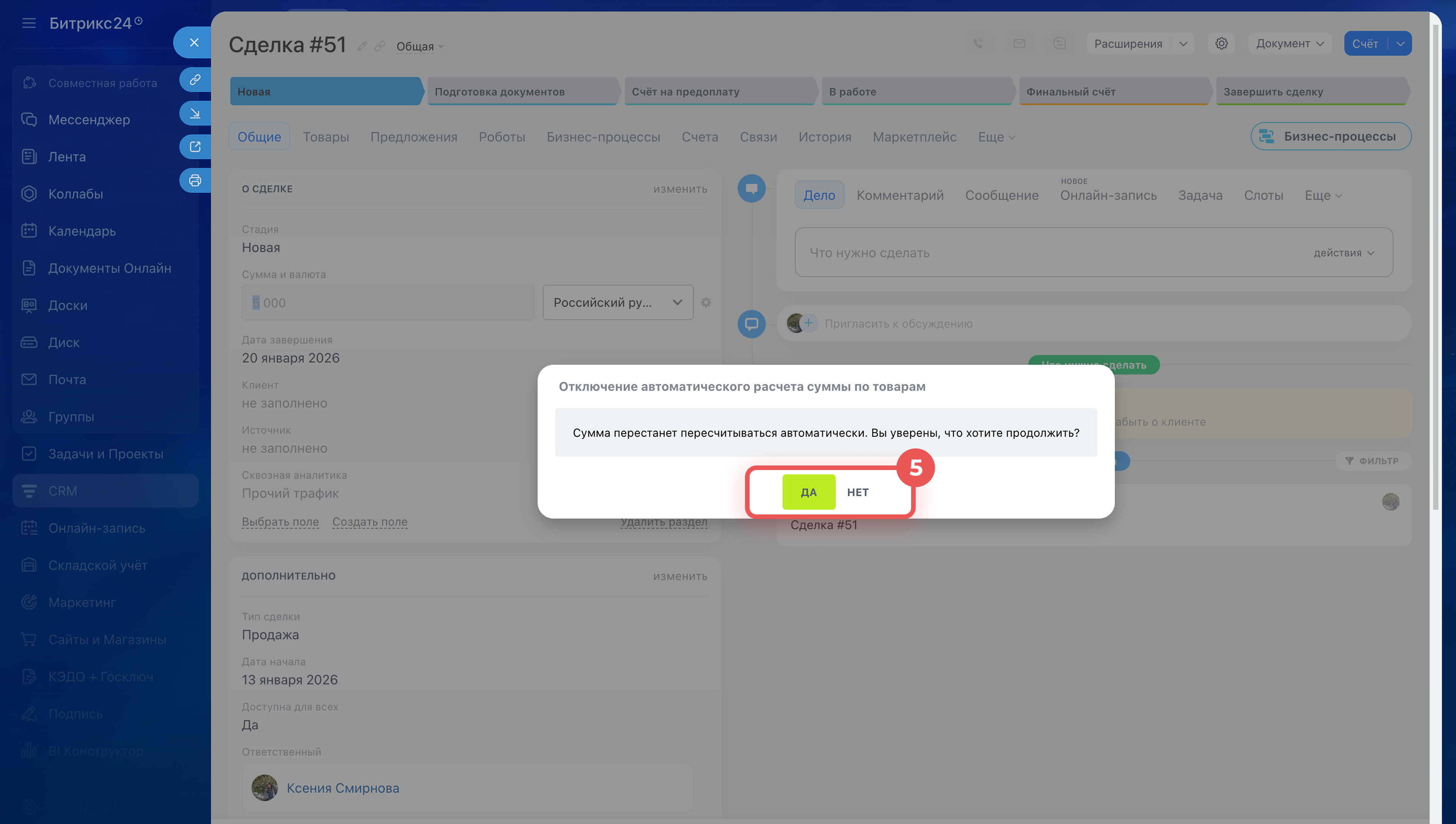 Если в сделку уже добавлены товары, CRM уточнит, действительно ли вы хотите отключить пересчет суммы.