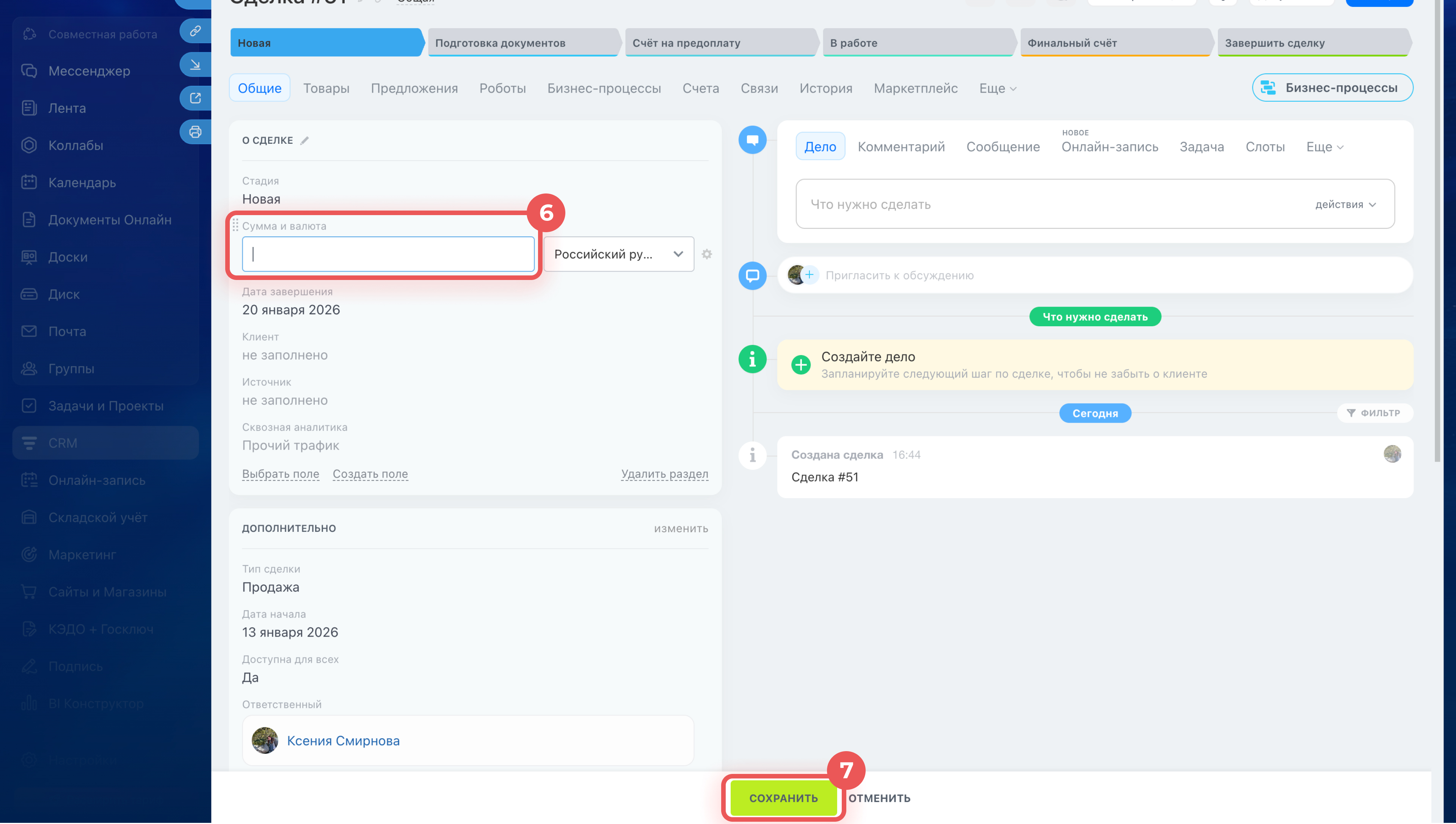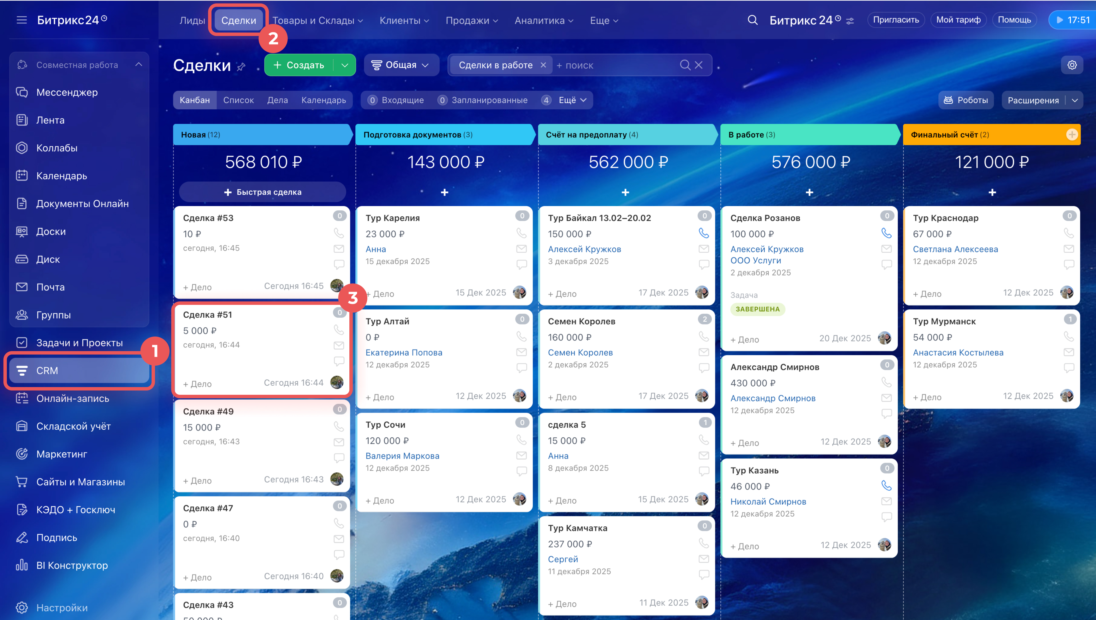 1–3. Перейдите в CRM > Сделки. Откройте нужную сделку.