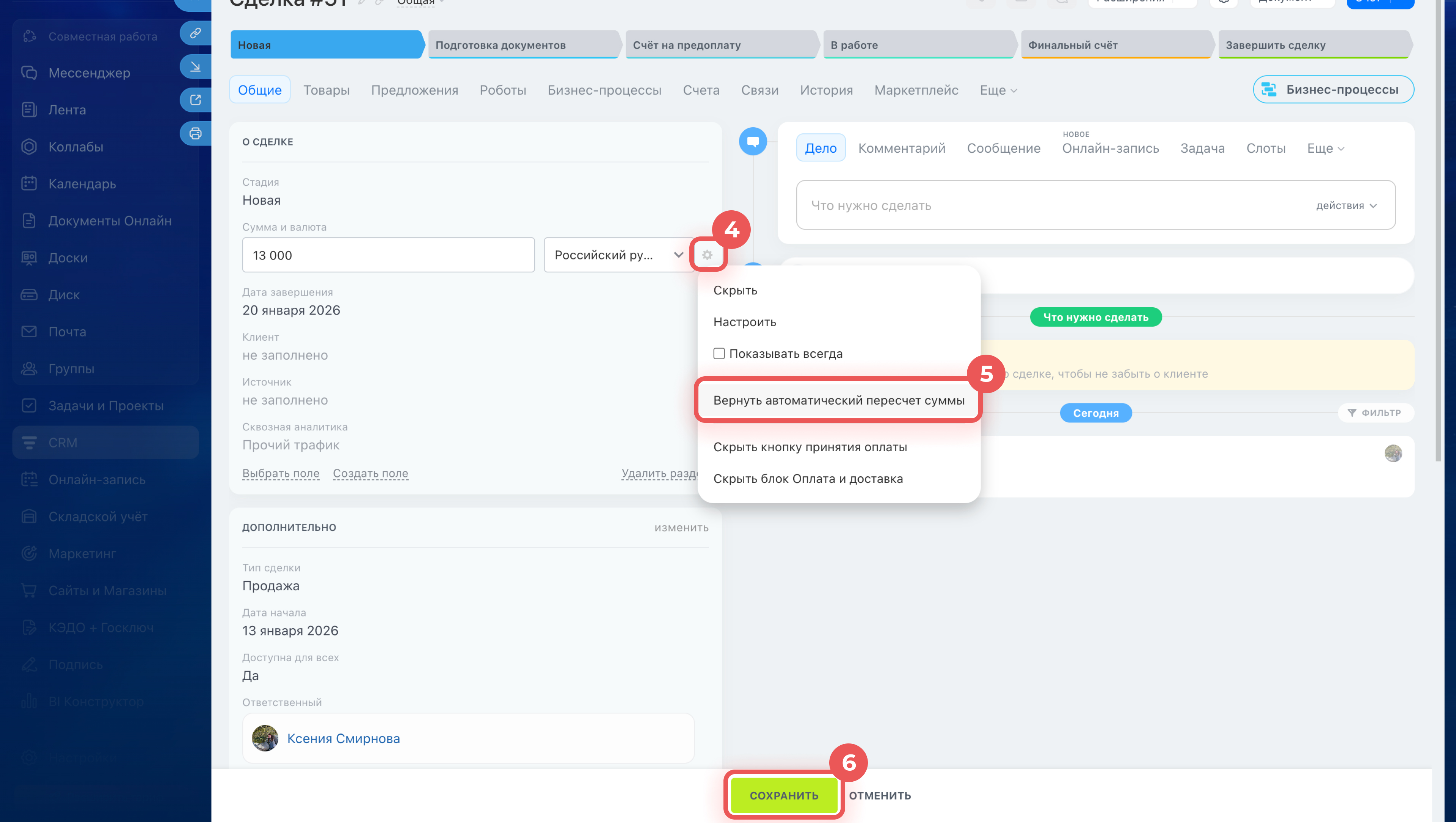 - В автоматическом режиме сумма обновляется при каждом изменении товаров или услуг, добавленных в сделку.