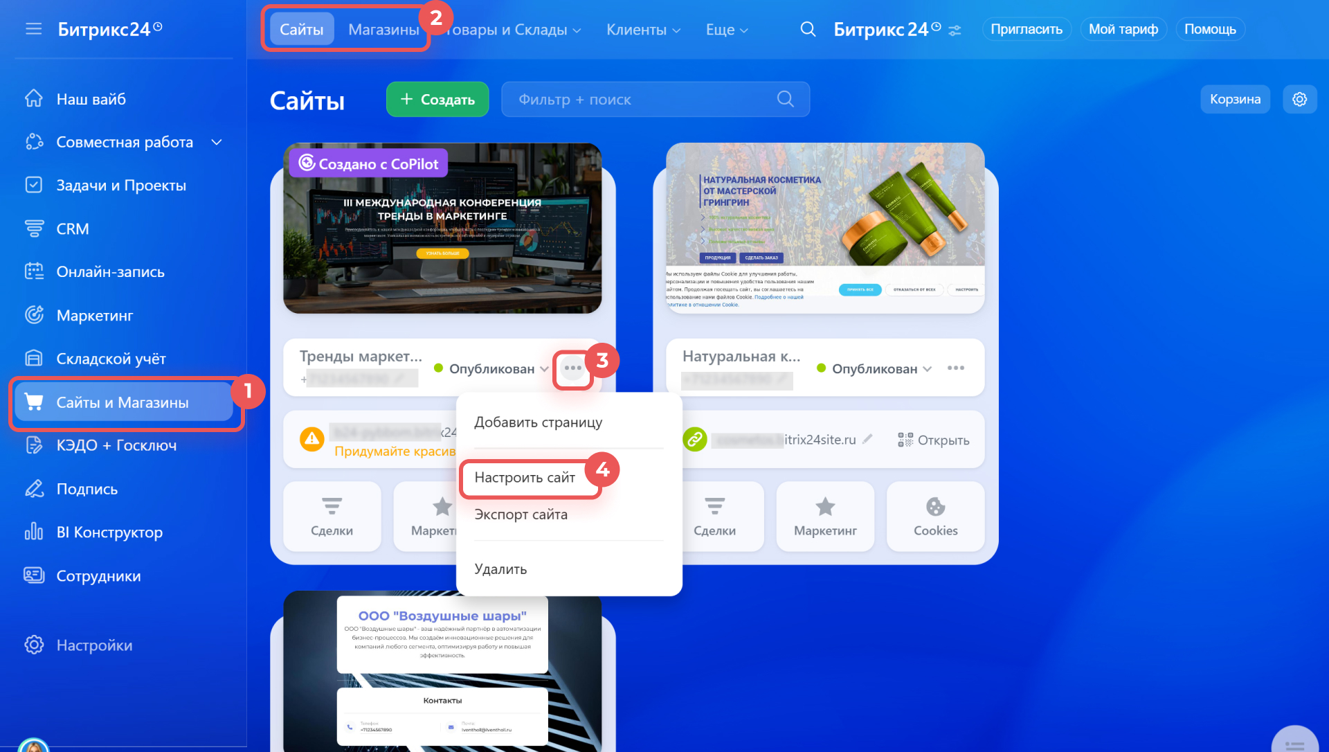 1–2. Перейдите в раздел Сайты и Магазины и выберите нужную вкладку: Сайты или Магазины.