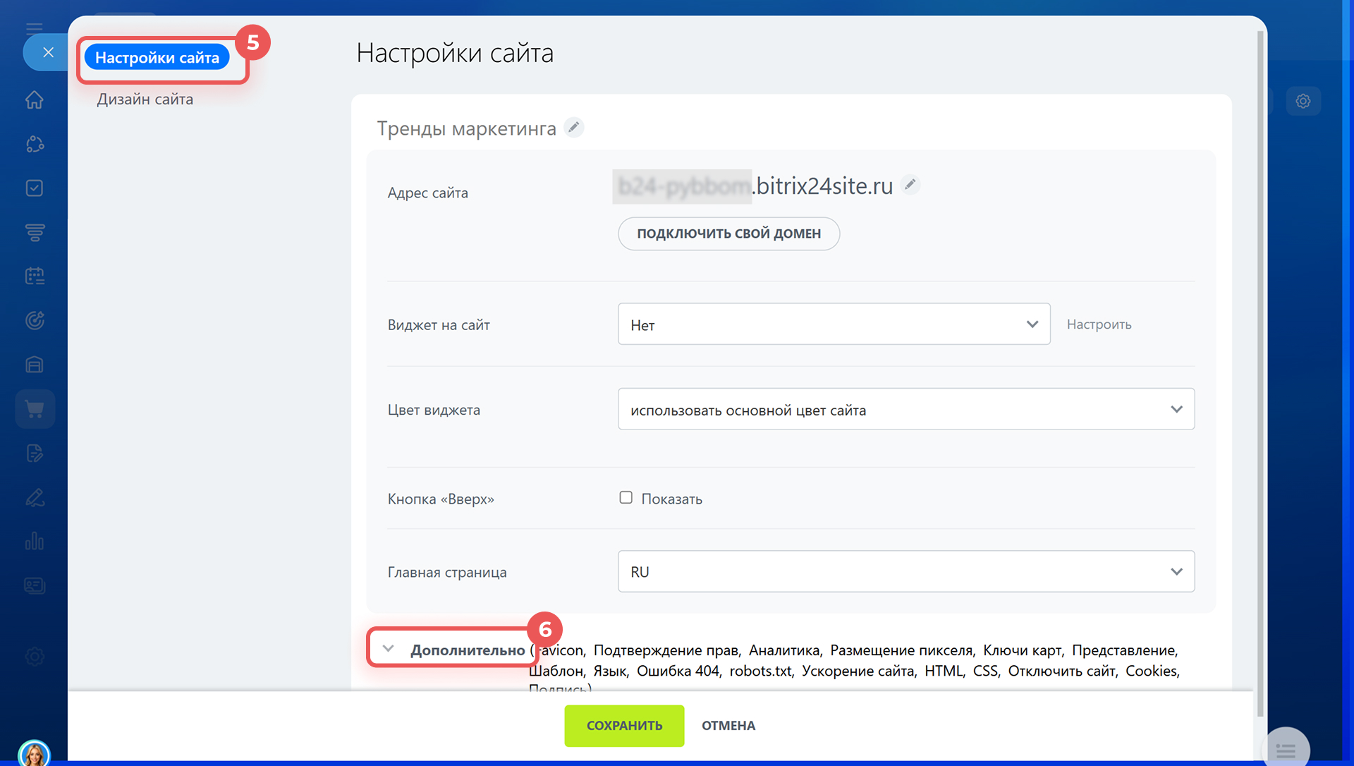 4–5. На вкладке Настройки сайта нажмите Дополнительно.