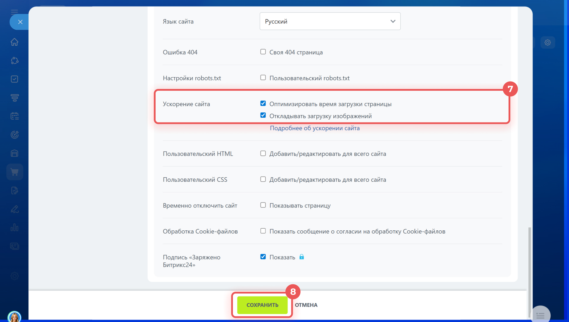 - Чтобы ускорить работу сайта, перейдите в раздел Сайты и Магазины > Сайты и выберите нужный. Нажмите на Три точки (...) > Настройки сайта > Дополнительно. В разделе Ускорение сайта включите опции Оптимизировать время загрузки страницы и Откладывать загрузку изображений. Сохраните изменения.