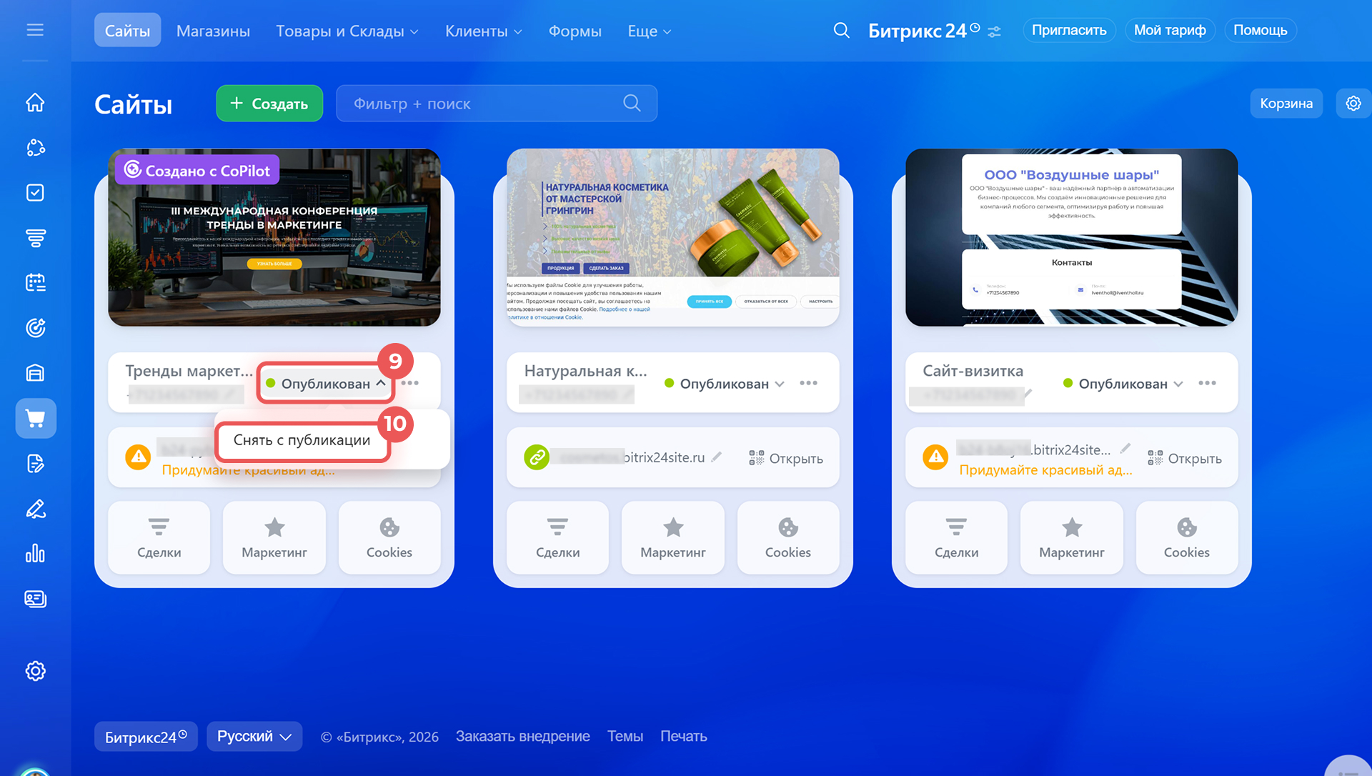 9–10. Переопубликуйте сайт для корректной работы настроек. Нажмите на статус сайта, снимите его с публикации и опубликуйте заново.