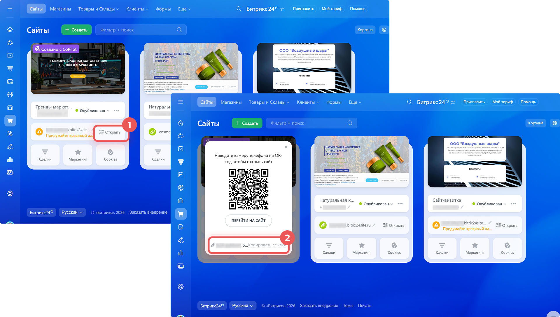 1–2. Выберите нужный сайт и нажмите Открыть > Копировать ссылку.