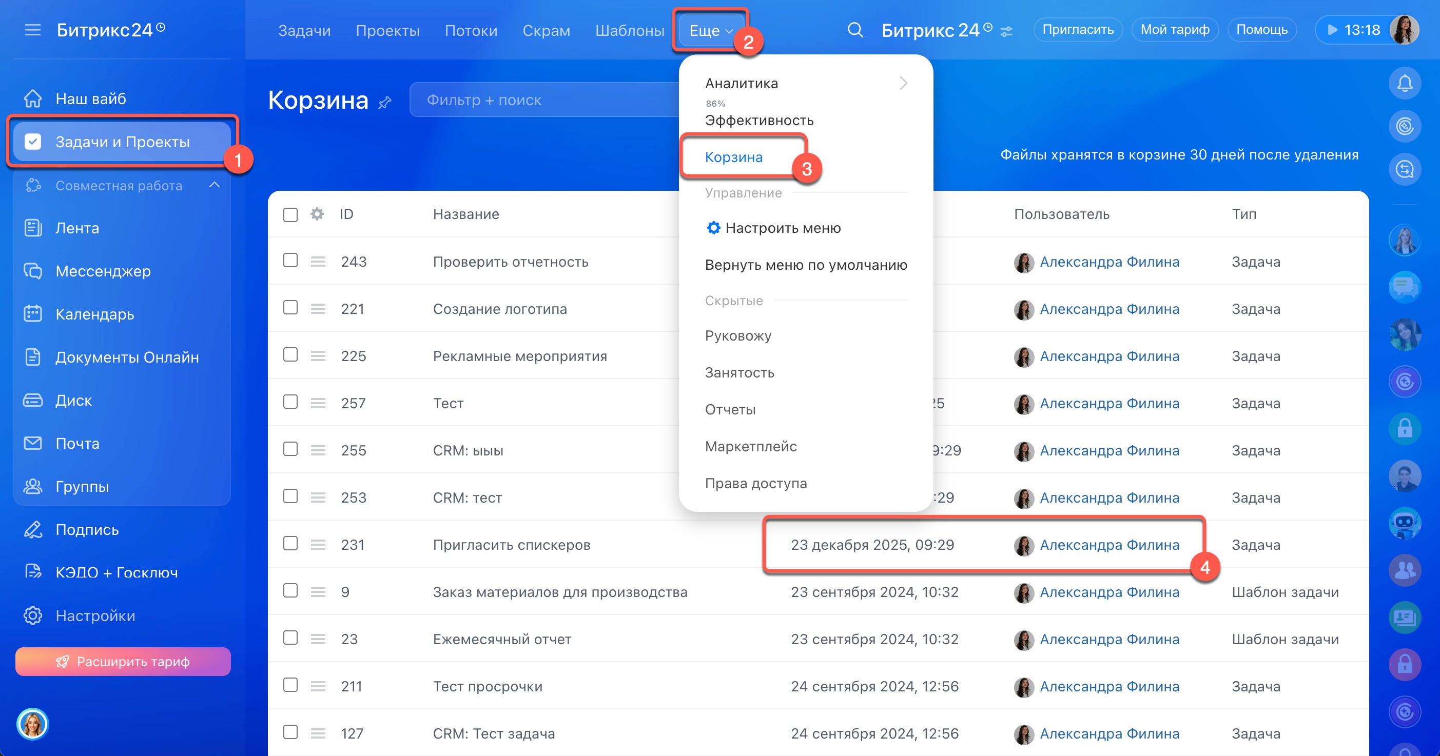 1–4. Перейдите в раздел Задачи и проекты > Еще > Корзина. Откроется список задач, где видно, кто и когда удалил их.