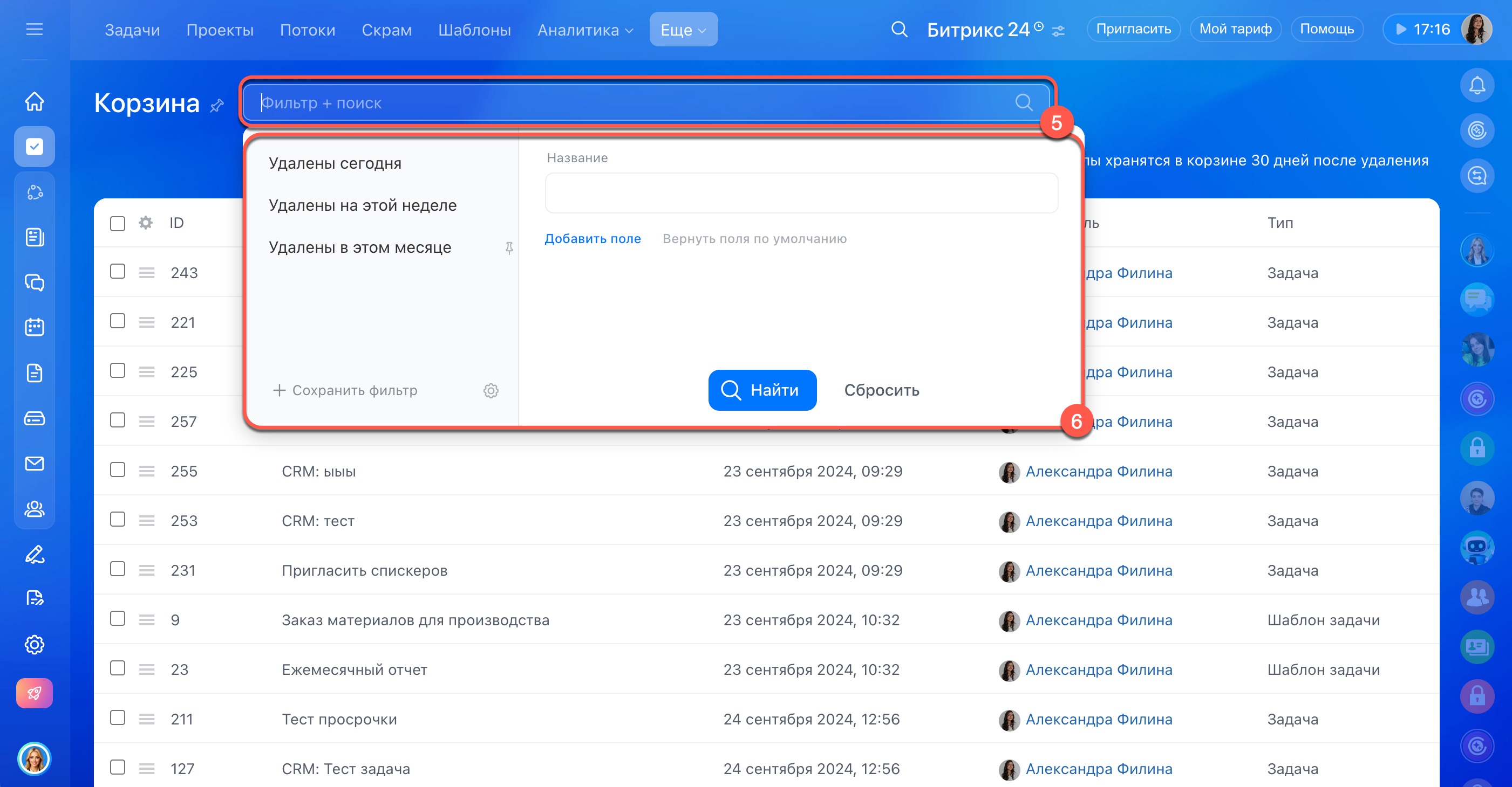 7–9. Если вы администратор Битрикс24, удаленные задачи конкретного сотрудника можно найти через фильтр: добавьте поле Пользователь и выберите нужного.
