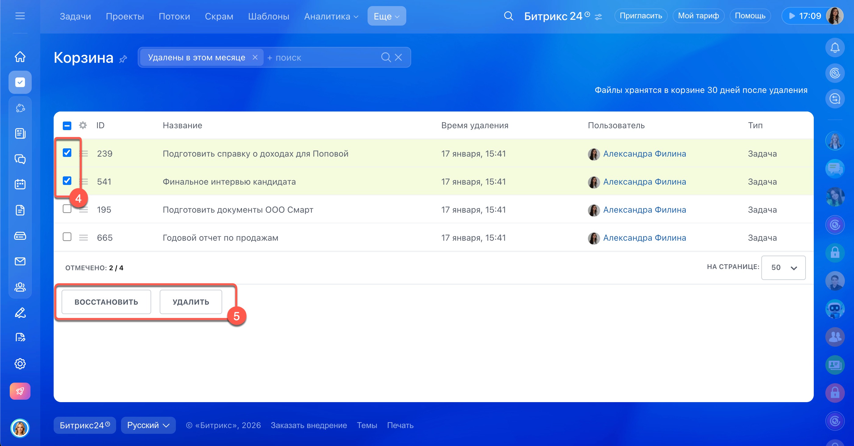 4–5. Отметьте одну или несколько задач и выберите нужное действие: удалить или восстановить.