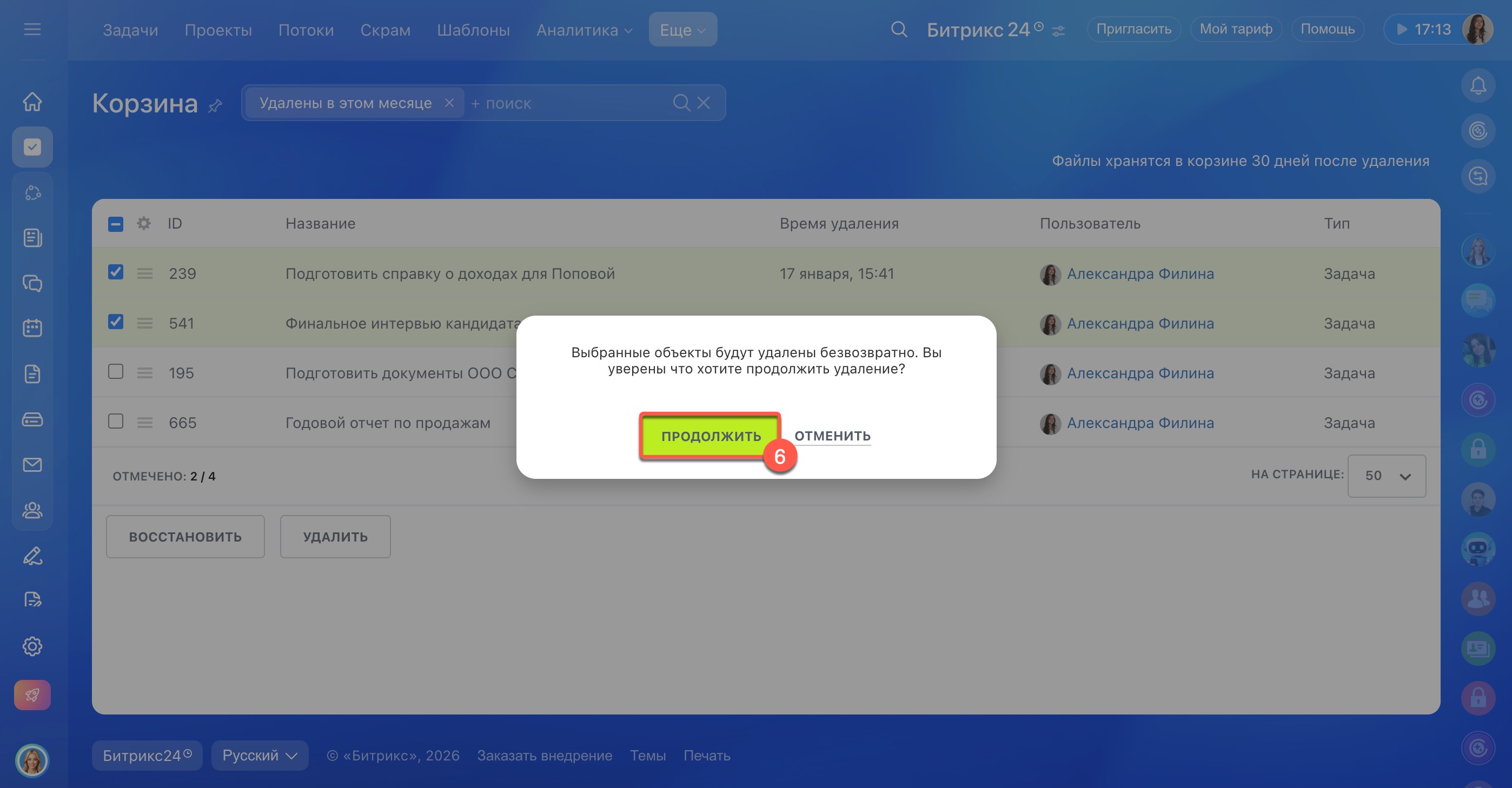 В Битрикс24 удаленные задачи сначала попадают в корзину и хранятся там 30 дней. Если задачу удалили по ошибке и в ней остались нужные обсуждения или файлы, ее можно восстановить вместе с историей чата. Если задача больше не нужна, ее можно удалить из корзины навсегда. Через 30 дней она удаляется автоматически.