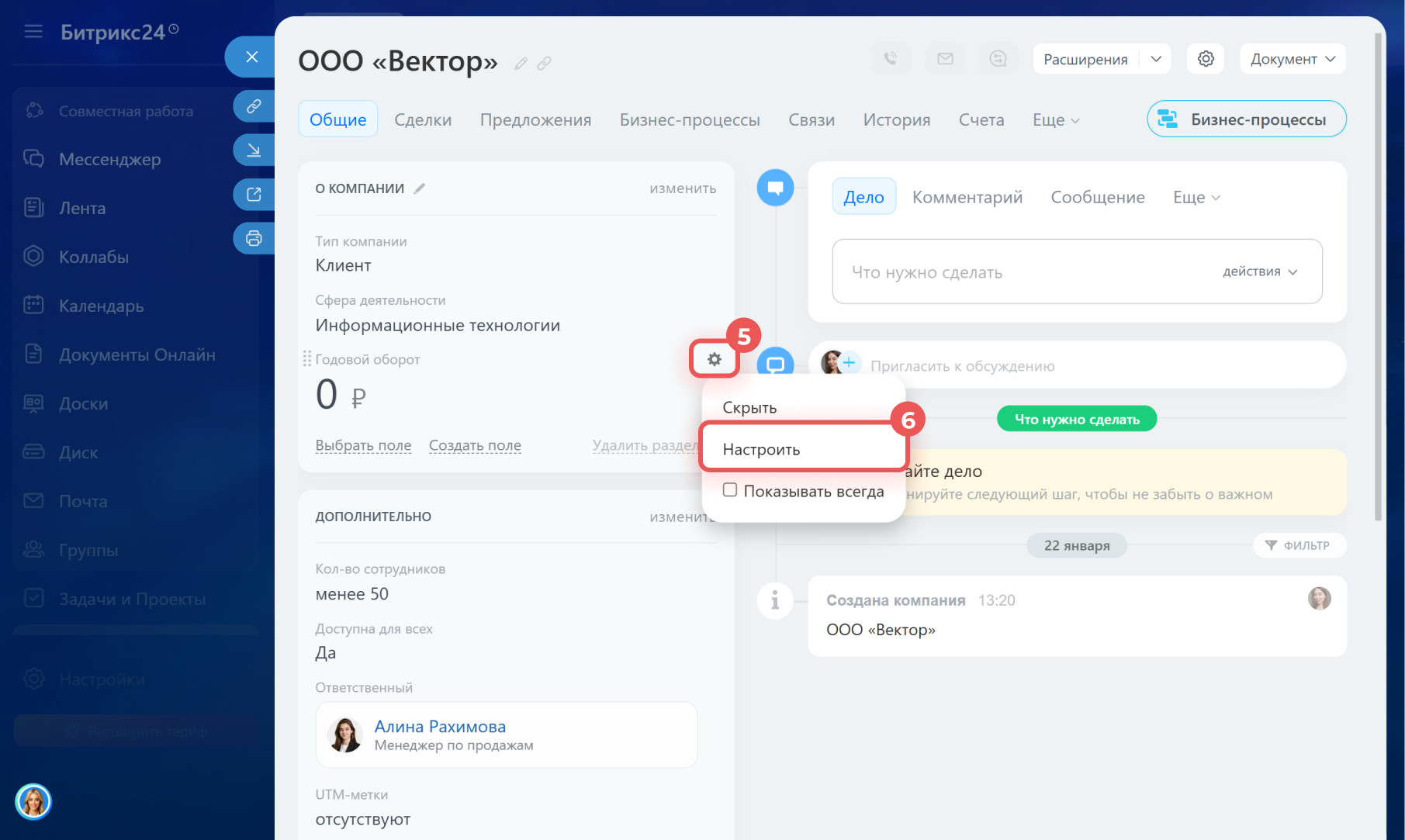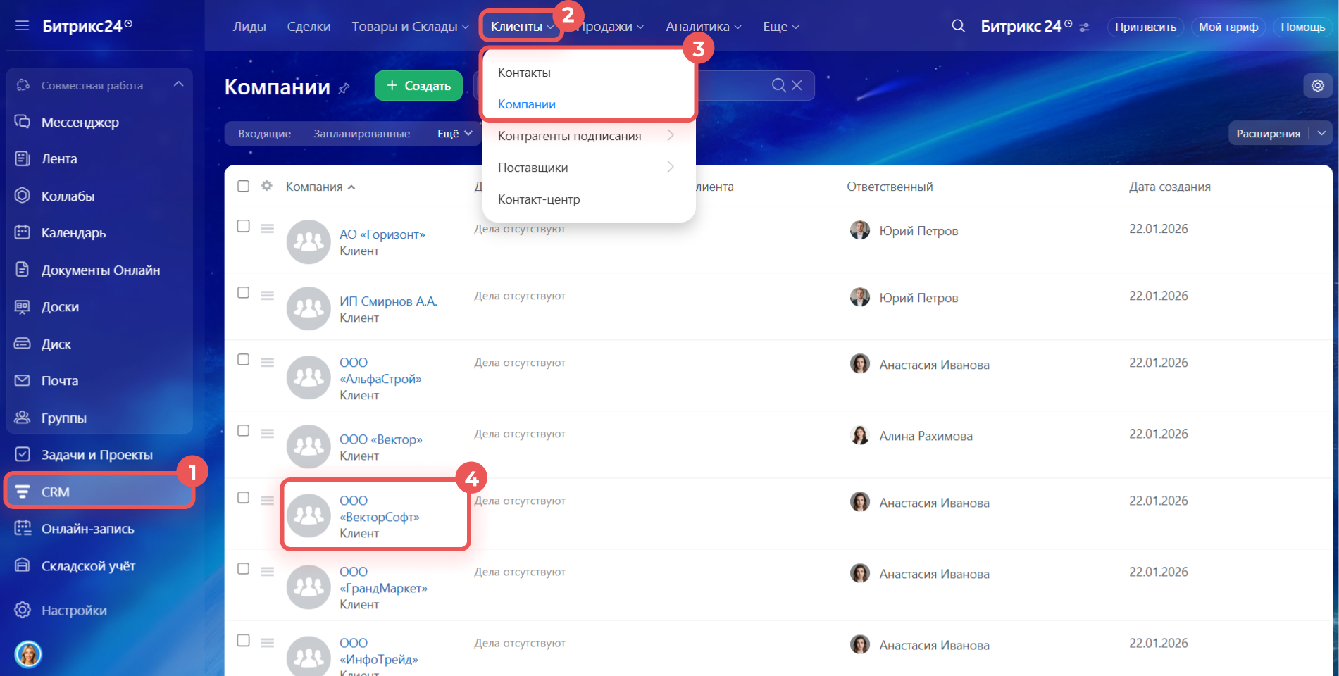 1–4. Перейдите в CRM > Клиенты > Контакты или Компании и откройте нужную карточку.