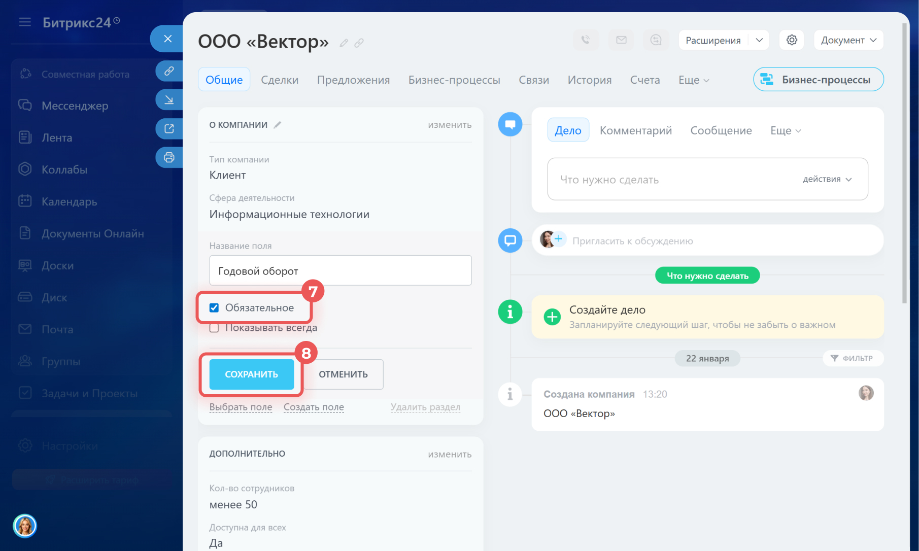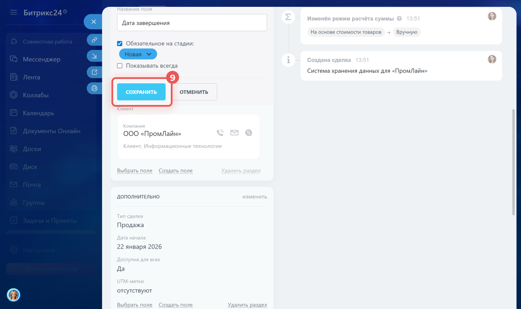 - Пользовательские и некоторые системные поля в CRM можно сделать обязательными. Сотрудник не сможет сохранить или переместить элемент, пока их не заполнит.