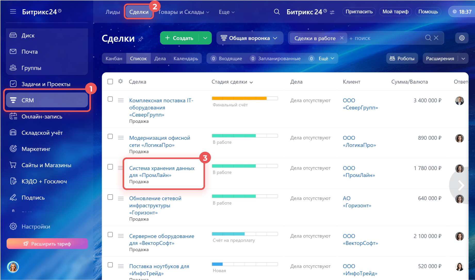 1–3. Перейдите в CRM > Сделки и откройте нужную карточку.