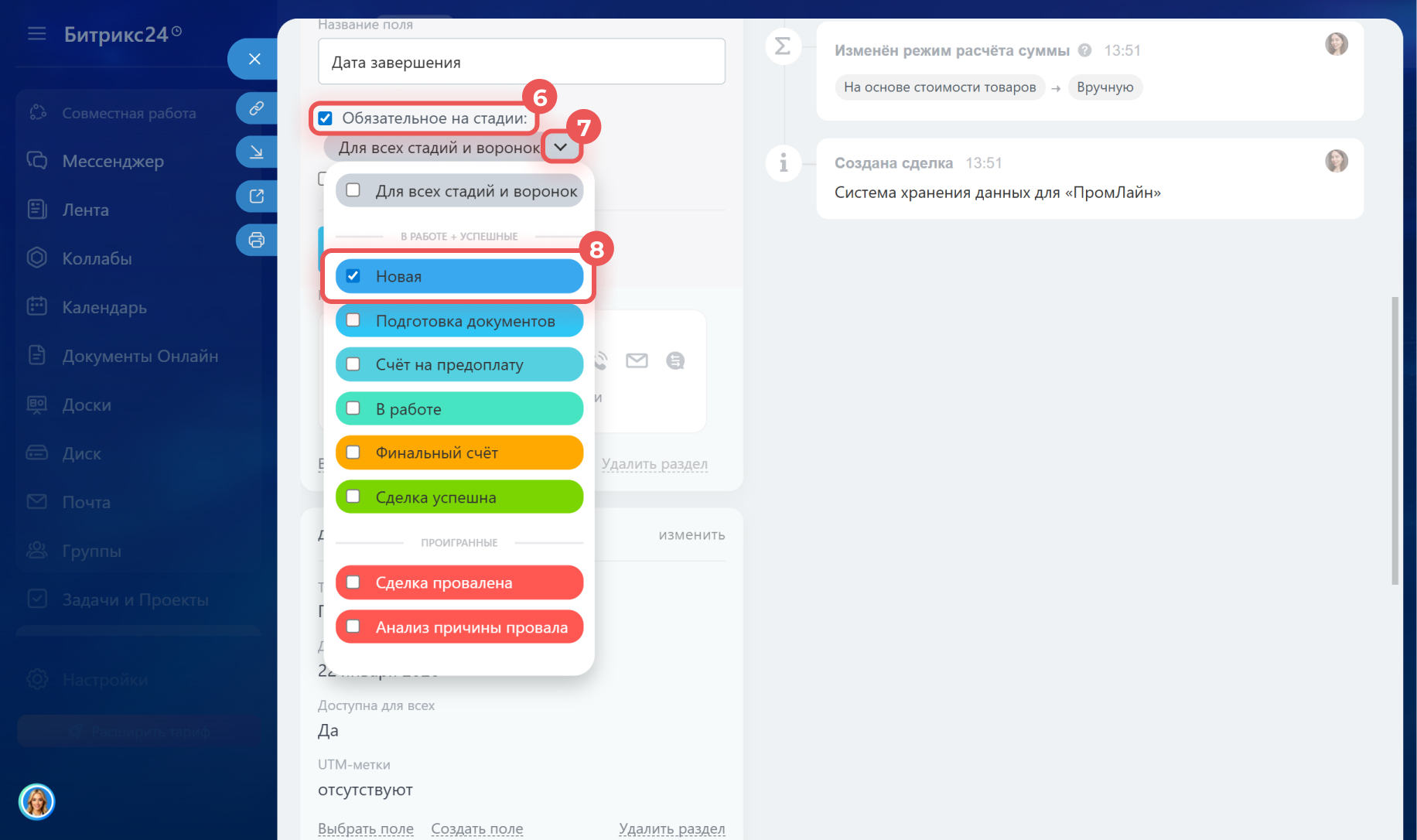 - В лидах, сделках, счетах, предложениях и смарт-процессах поле можно сделать обязательным на всех или определенных стадиях.