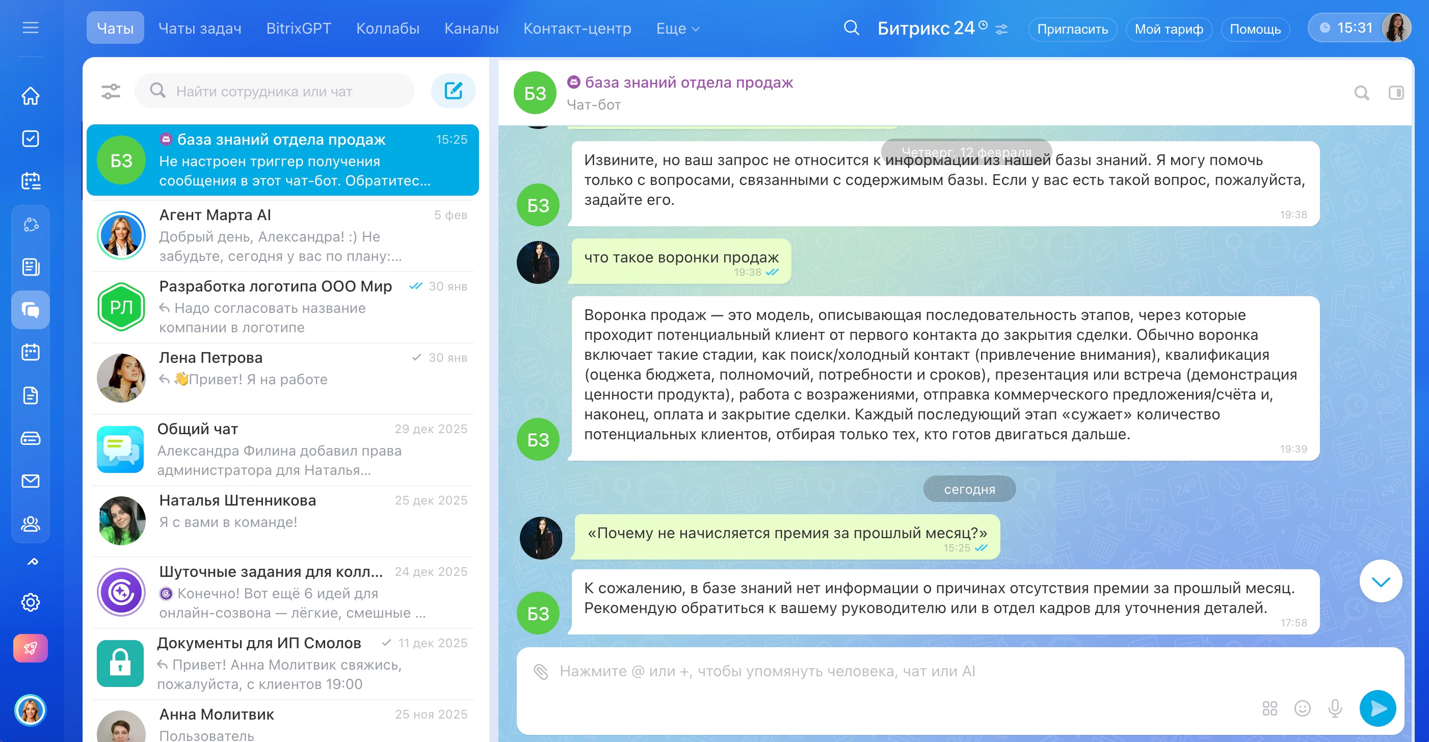 Если ответ кажется неполным, проверьте, есть ли у вас доступ к нужным разделам — сделкам, задачам, календарю и другим инструментам.