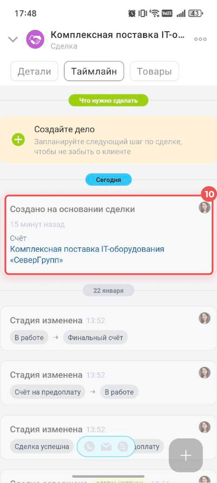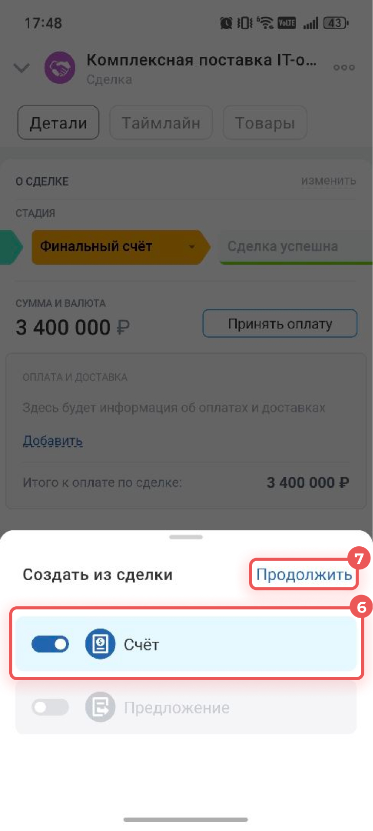Когда клиент рассмотрел предложение и готов к покупке, менеджер создает из предложения счет. Новый элемент отображается в таймлайне предложения.