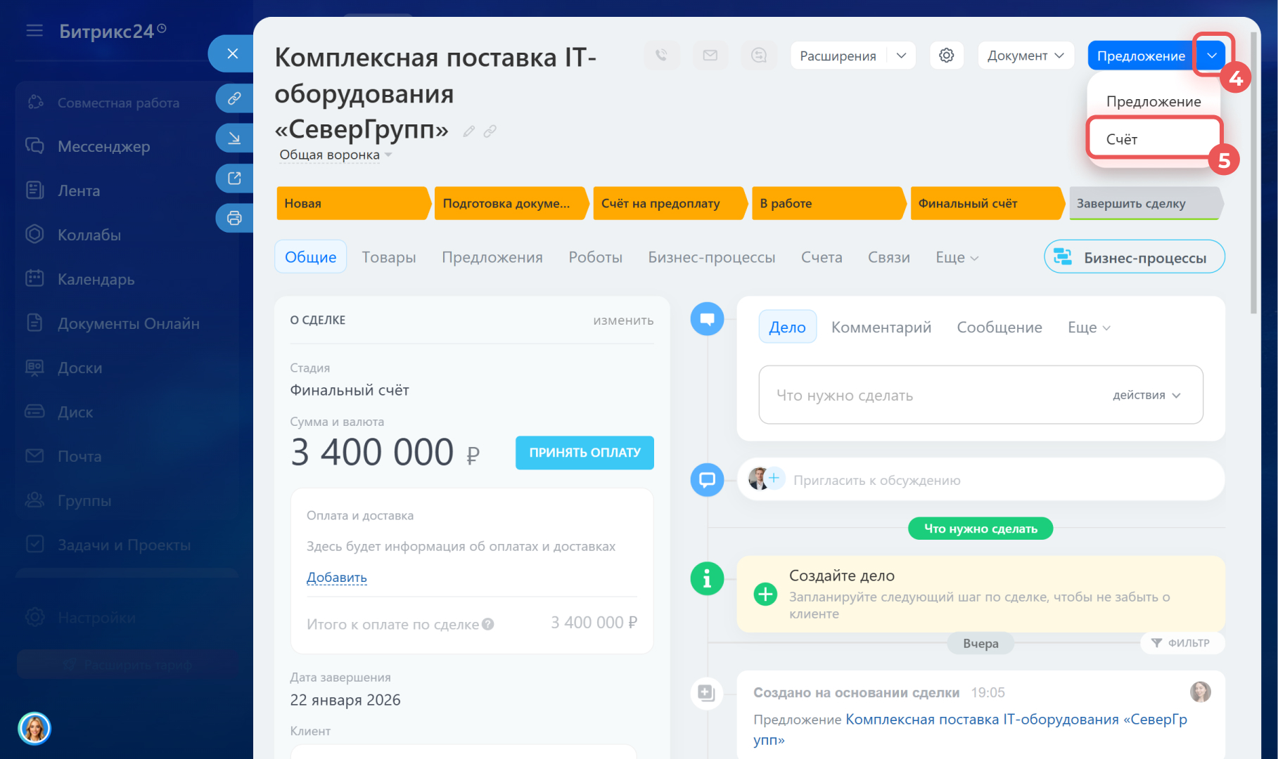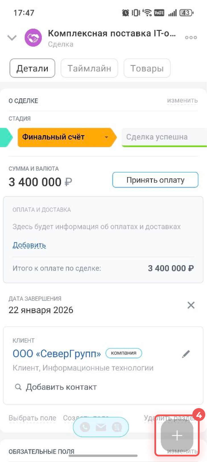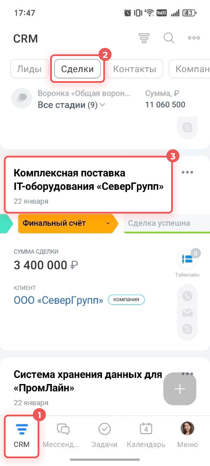 1–3. Перейдите в CRM > Сделки и откройте нужную.
