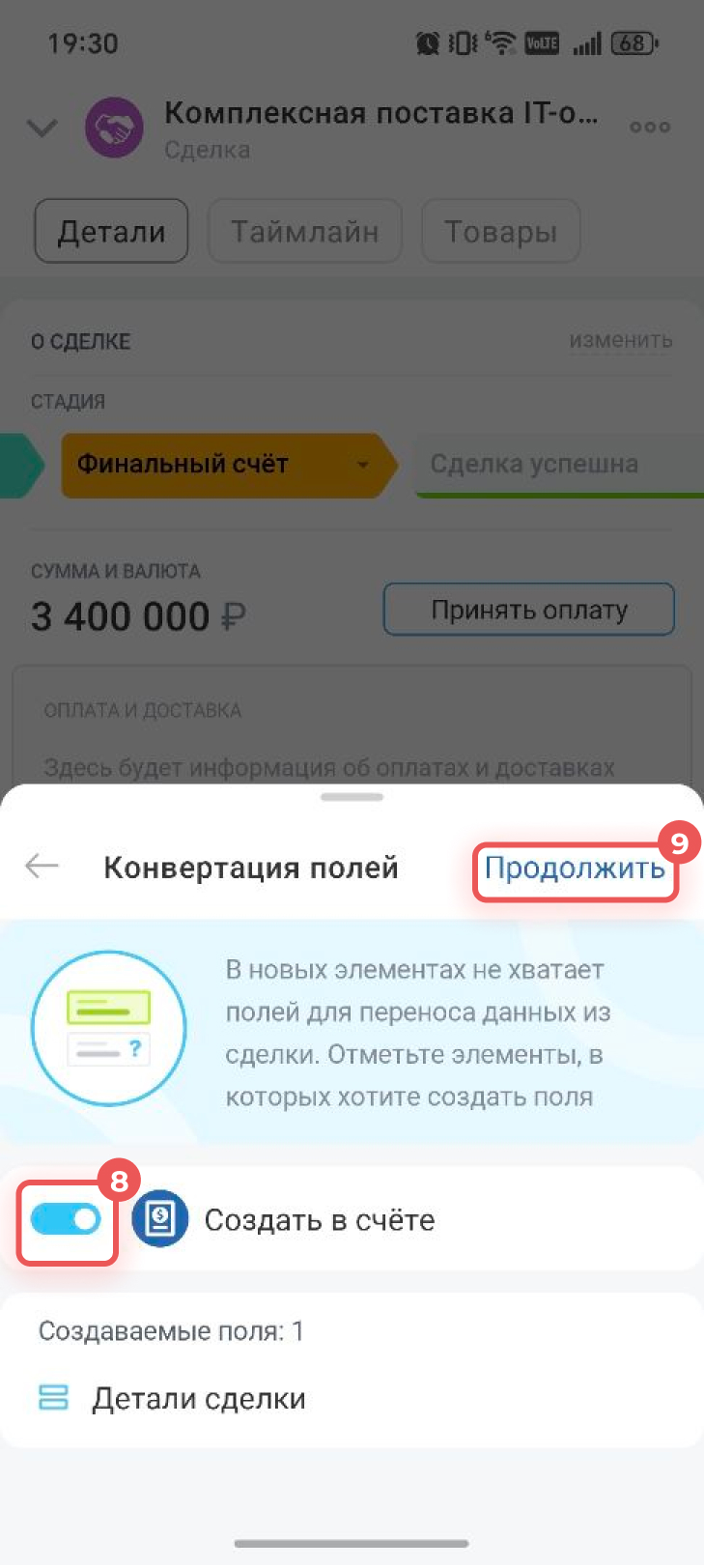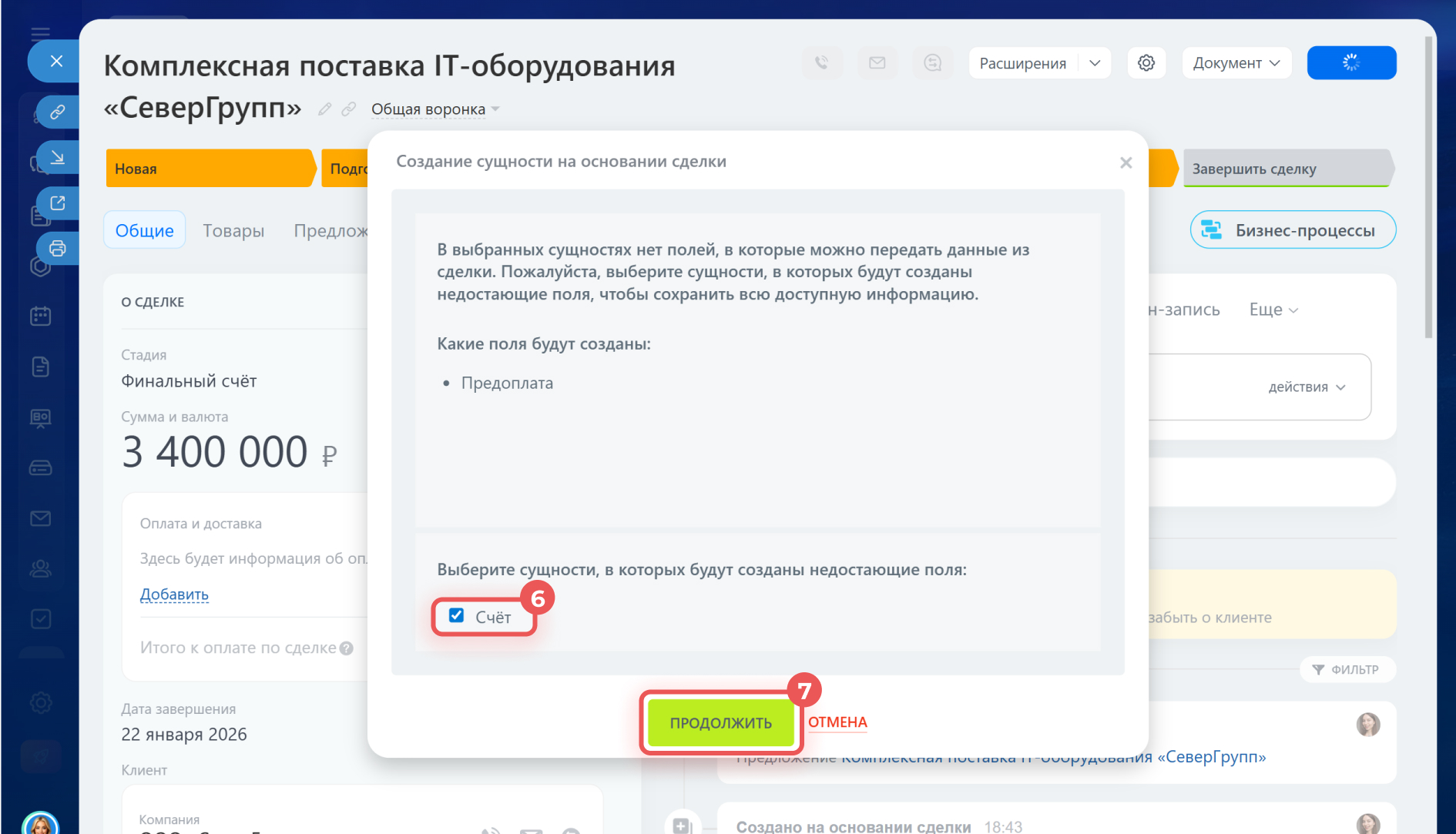 5–7. Выберите Счет. Если в исходном элементе есть пользовательские поля, которых нет в новом элементе, будет предложено создать такие же поля. Поставьте галочку рядом с элементом, если хотите создать поля, и нажмите Продолжить. На основании сделки будет создан счет, и откроется его карточка.