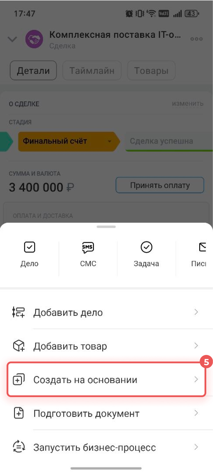 - Чтобы создать элемент на основании другого в мобильном приложении, перейдите в CRM > Сделки и откройте нужную. Нажмите Плюс (+) в правом нижнем углу, нажмите Создать на основании и выберите элемент.