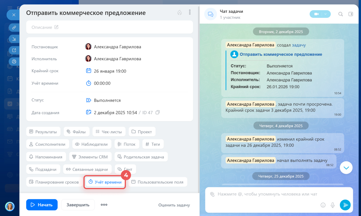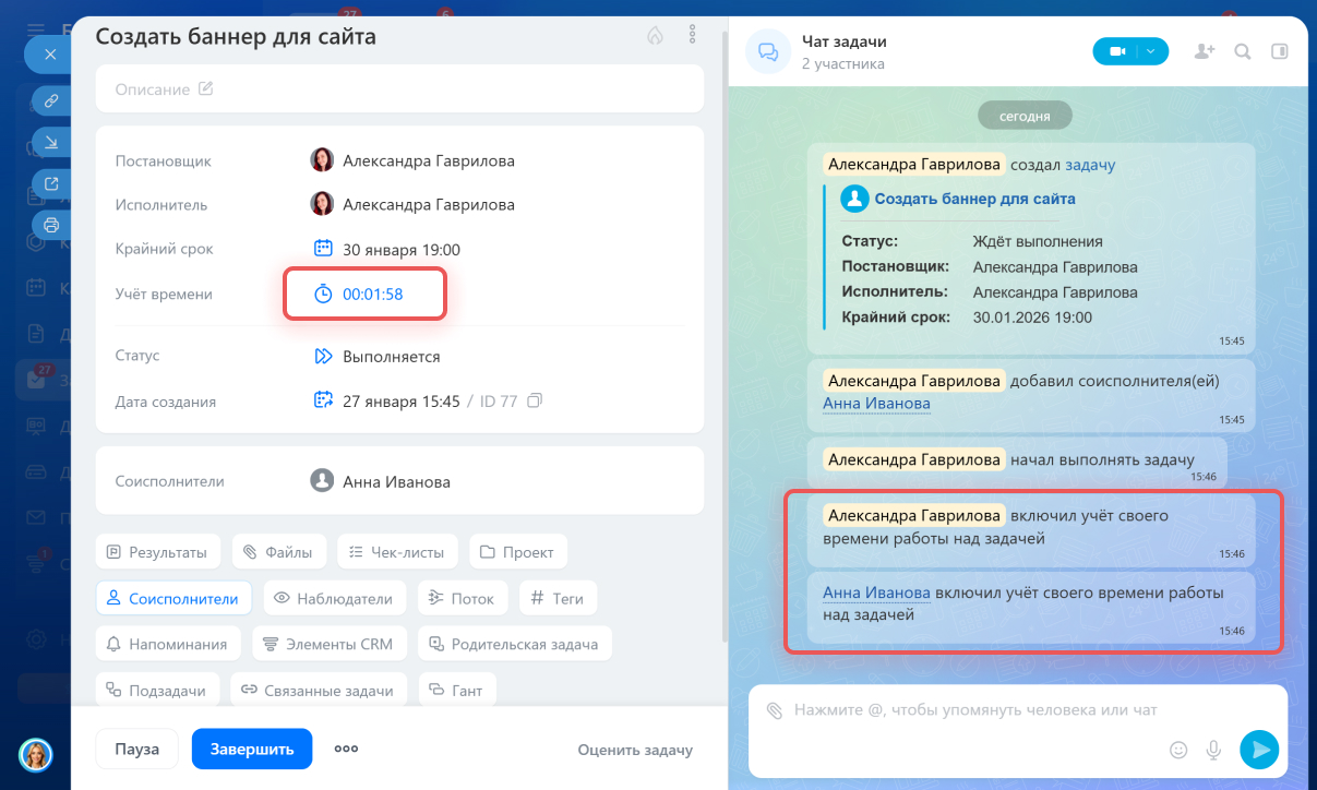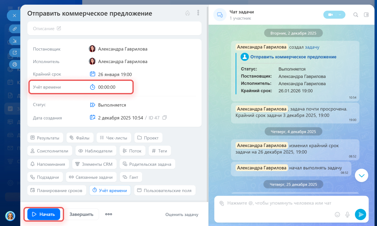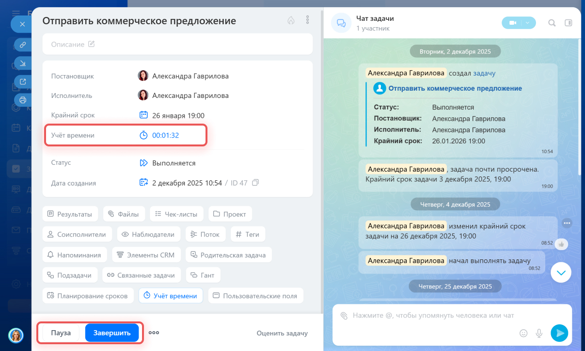 - Завершить — задача будет закрыта и учет времени прекратится для всех сотрудников.