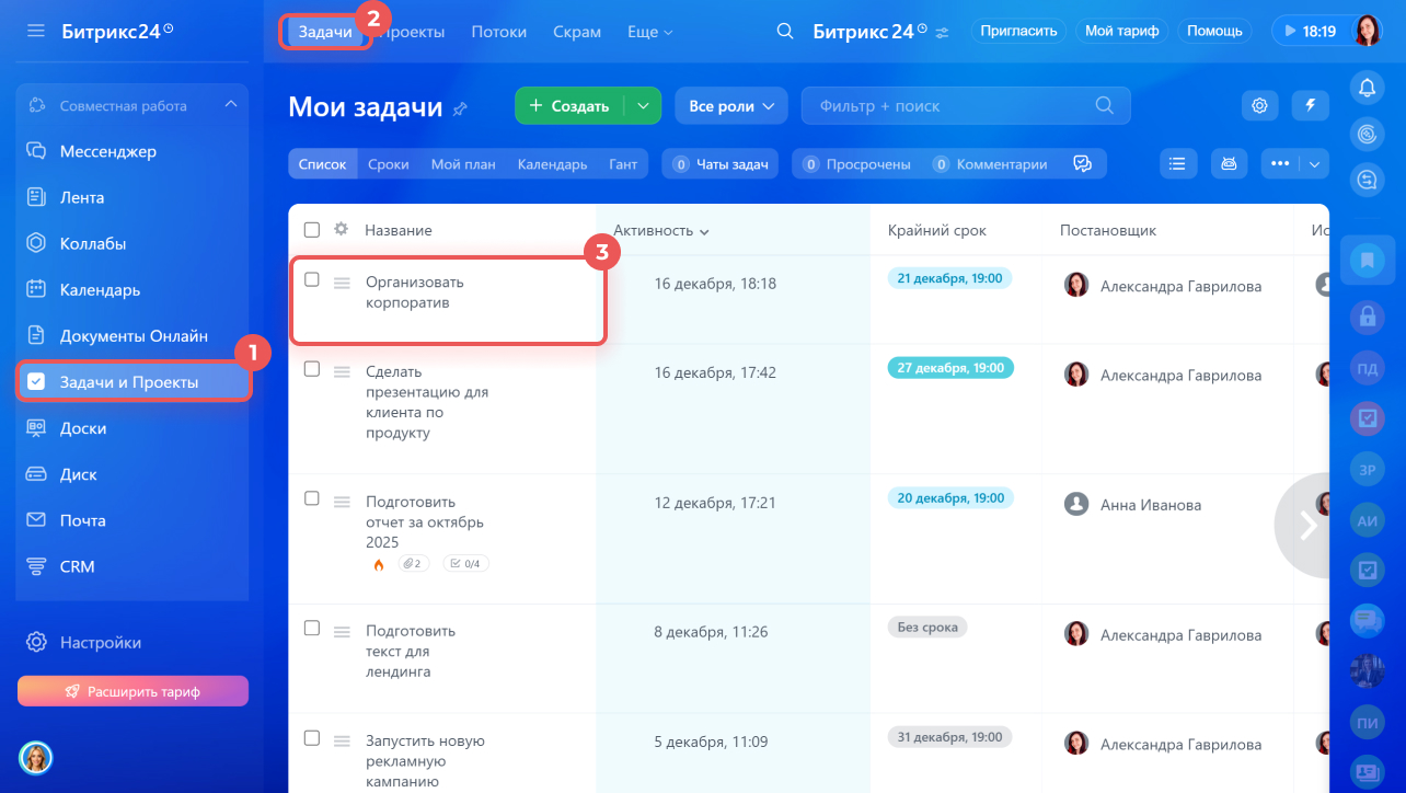 1–3. Перейдите в Задачи и проекты > Задачи и откройте карточку задачи.