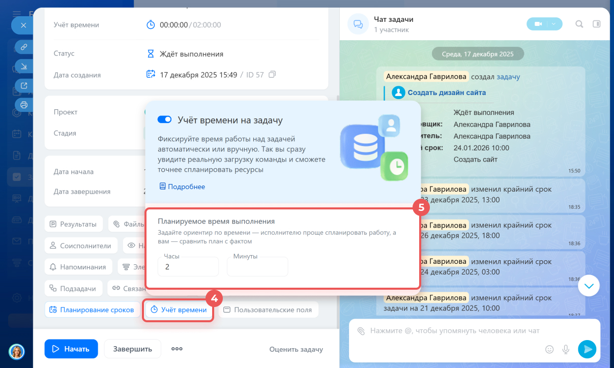 - Учет времени включается прямо в задаче — это может сделать постановщик. После этого в задаче можно указать планируемое время и фиксировать фактическое.